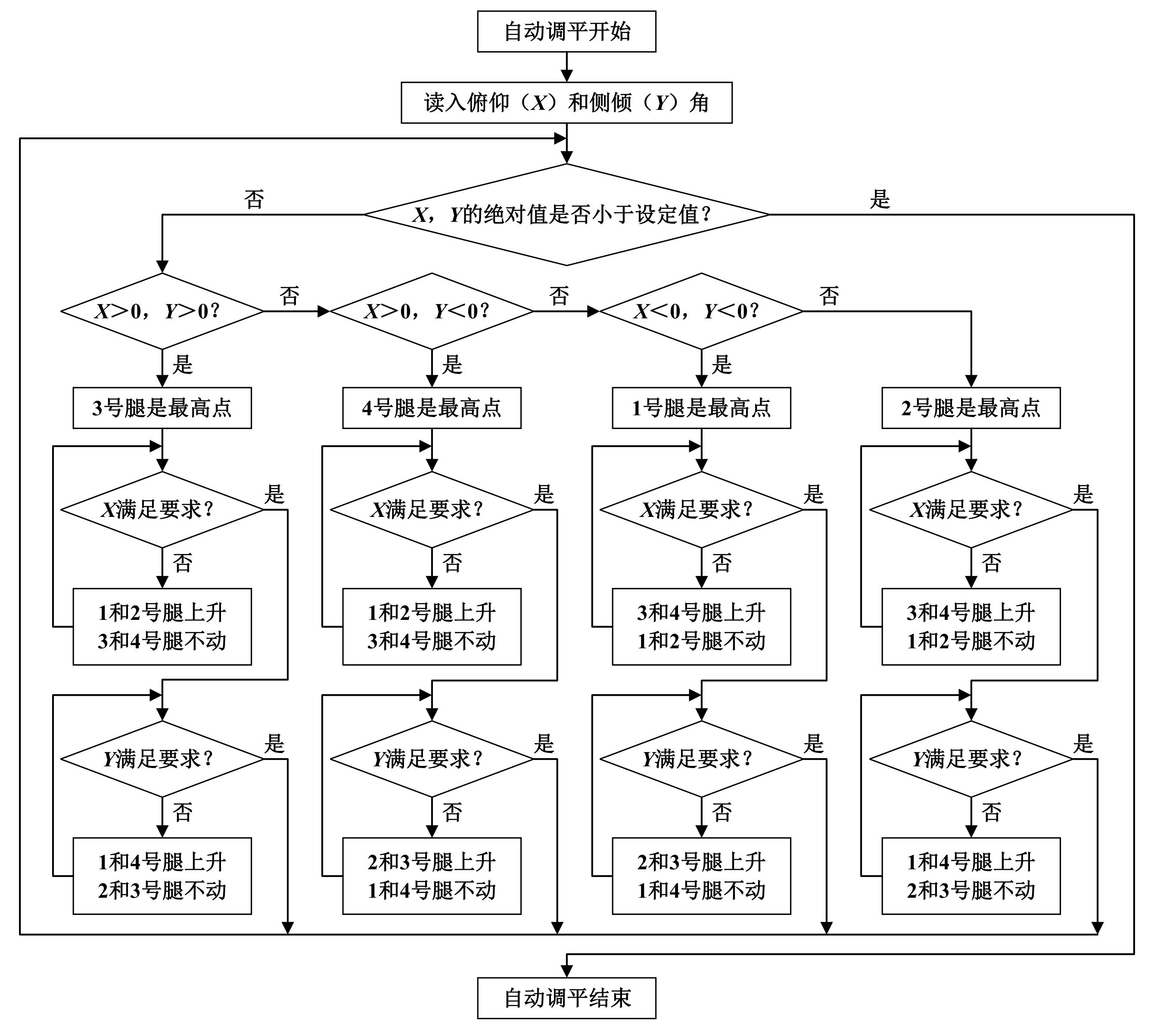 | 山东理工大学等[ | | 前轮采用被动减震技术,后轮采用双导柱式伺服电缸,降低高频扰动影响的同时实现底盘在±0.2°精度、±9°范围内的全向调平 | 平缓丘陵地;动态调平 | |