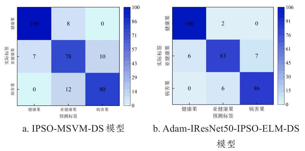 图8 IPSO-MSVM-DS模型和Adam-IResNet50-IPSO-ELM-DS模型在苹果独立测试集的混淆矩阵Fig. 8 Confusion matrix of the IPSO-MSVM-DS and Adam-IResNet50-IPSO-ELM-DS model on the apple independent test set |