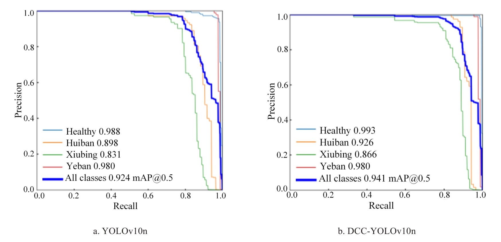 | 病害类型 | Faster R-CNN | SSD | RT-DETR | YOLOv8n | YOLOv9t | YOLOv10n | YOLOv10s | YOLOv10m | YOLOv11n | DCC-YOLOv10n |