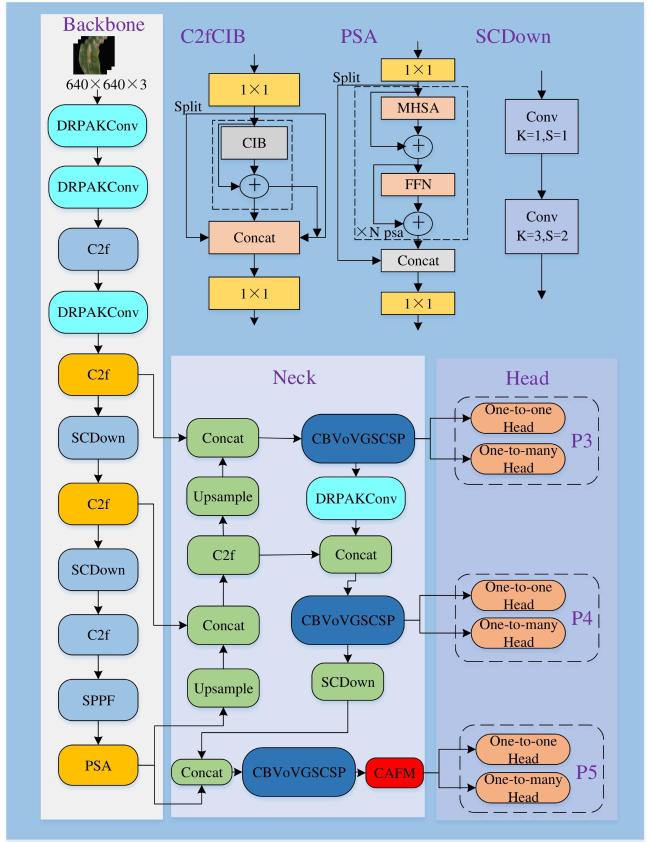| 算法 | DRPAKConv | CBVoVGSCSP | CAFM | P/% | R/% | mAP@0.5/% | 计算量/GFLOPs | 参数量/M | 模型大小/Mb | 帧率/(帧/s) |