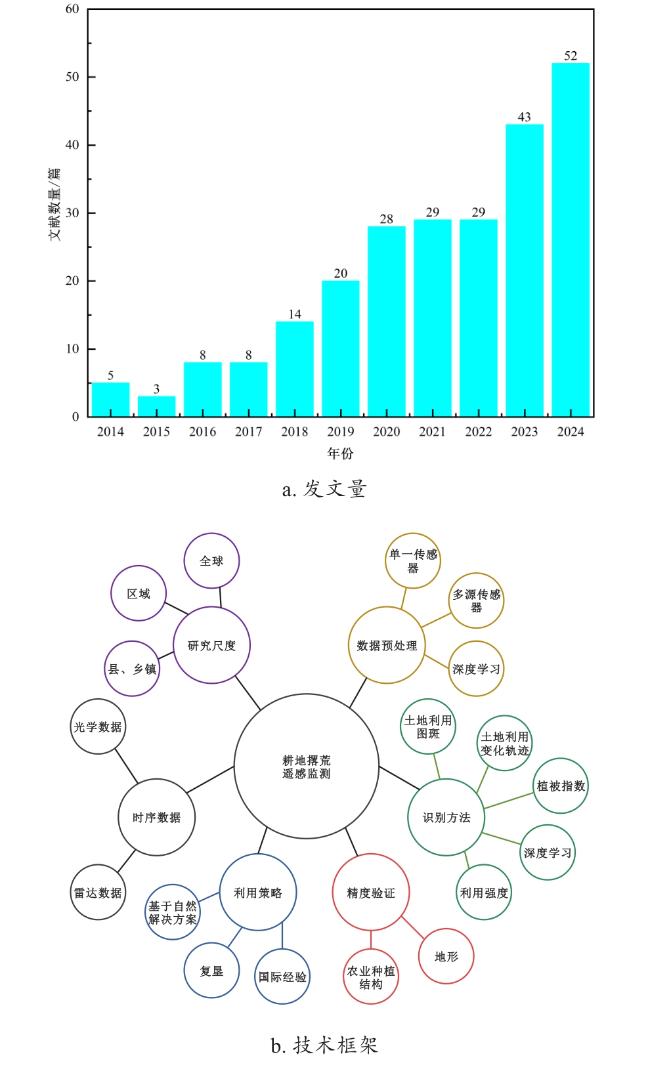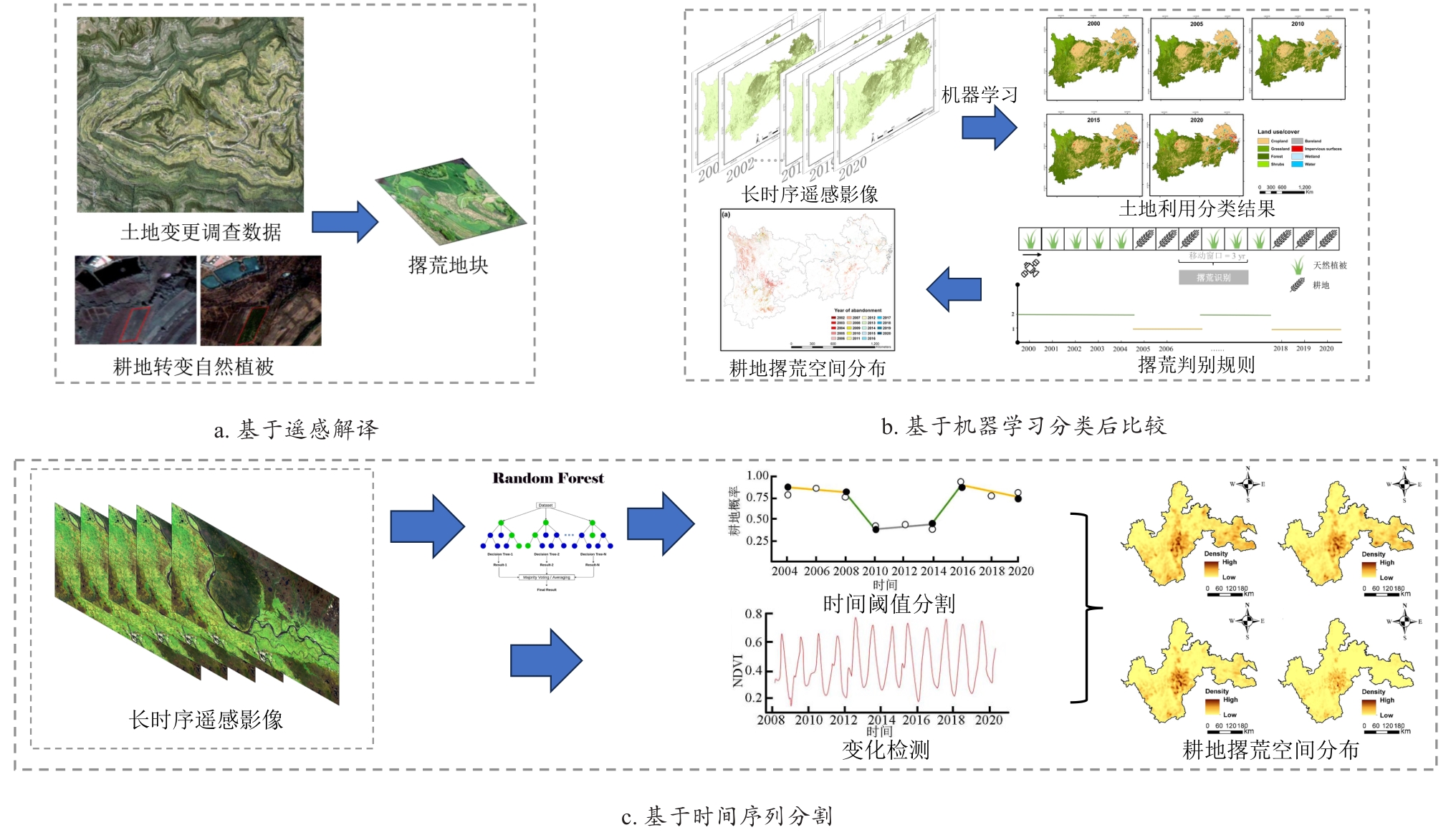 [Significance] Cropland abandonment in hilly and mountainous regions is a pronounced manifestation of land‐use marginalization, with profound implications for both regional food security and ecosystem service provision. In southern China, this issue is particularly acute due to a confluence of factors including early and rapid urbanization, rugged topographic relief, complex multi‐cropping systems, and substantial rural‐to‐urban labor migration, which have driven widespread abandonment of steep, fragmented terraces. This trend presents a profound dual dilemma: On one hand, the cessation of cultivation diminishes local grain production capacity, amplifies pressure on existing cropland, and threatens national food supplies; On the other hand, the secondary succession of spontaneous vegetation on these deserted parcels offers significant carbon sequestration potential and contributes to biodiversity recovery. Yet, accurately mapping these spatio-temporal patterns is severely hampered by persistent cloud cover and the landscape's complexity. This leaves decision-makers without the timely, high‐resolution maps needed to track abandonment dynamics, uncover their socioeconomic and environmental drivers, and craft land-use policies that holistically balance agricultural output, carbon storage, and landscape resilience. [Progress] Drawing from literature published since 2014, this paper systematically reviews remote sensing‐based methods for cropland abandonment, revealing a clear developmental trajectory. Methodologically, the approaches have evolved along two parallel paths. First, the monitoring paradigm has shifted from early "state comparison" methods, such as post-classification comparison of discrete multi-temporal images, to modern "process tracking" approaches. These leverage dense time series, utilizing phenology‐aware algorithms such as LandTrendr and BFAST to identify abrupt or gradual breaks in the vegetation trajectory, thus capturing the dynamics of abandonment and distinguishing it from short-term fallows. Second, the identification algorithm has progressed from traditional machine learning classifiers and object-based image analysis (OBIA), which depend on hand‐crafted features, towards sophisticated deep learning frameworks capable of automatically learning complex spatio-temporal signatures. Concurrently, data pre-processing techniques have advanced significantly, with harmonic analysis, Savitzky-Golay filtering, and the integration of Synthetic Aperture Radar (SAR) data now routinely applied to reconstruct continuous, high-quality time series. Furthermore, this review provides a critical synthesis of common methodological issues, focusing on the spatio-temporal representativeness bias in ground validation samples and the multiple sources of uncertainty stemming from cloud cover, mixed pixels, and phenological variability. [Conclusions and Prospects] Despite considerable advances, persistent challenges continue to limit operational monitoring. Looking forward, the field must evolve from descriptive mapping toward a truly predictive and decision‐ready framework. This transformation hinges on five interlinked frontiers. First, it requires forging the seamless integration of diverse data streams: Fusing optical imagery, radar backscatter, and terrain models within cloud computing environments to yield uninterrupted, high‐resolution time series that capture both abrupt and gradual land‐use changes. Second, it necessitates the establishment of an extensive, stratified ground‐truth network; by systematically sampling high-risk, transitional, and reference plots and collecting synchronized measurements, researchers can iteratively recalibrate classification models and improve their resilience across the region's landscape mosaic. Third, on the algorithmic frontier, hybrid approaches that embed expert‐defined phenological rules within deep learning architectures offer a promising path to robustly disentangle permanent abandonment from temporary fallows and to quantify a continuous "abandonment intensity". Fourth, the deployment of fully automated and reproducible processing pipelines on cloud platforms like Google Earth Engine will democratize access to near-real‐time monitoring and enhance reproducibility through open-source workflows. Finally, anchoring detection within dynamic simulation frameworks (e.g., agent‐based models) driven by historical trajectories and key drivers will allow for the projection of future abandonment of "hotspots". Layering these projections with multi‐criteria risk assessments will yield spatially explicit risk maps to guide precision interventions—such as targeted recultivation subsidies or ecological restoration efforts—enabling sustainable land stewardship that simultaneously safeguards food security and enhances ecosystem resilience.