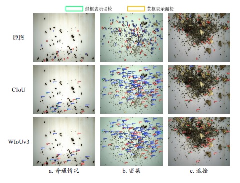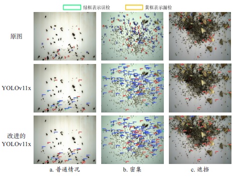 [Objective] Planthoppers suck the sap from the phloem of rice plants, causing malnutrition and slow growth of the plants, resulting in large-scale yield reduction. Therefore, timely and effective monitoring of planthopper pests and analysis of their occurrence degree are of vital importance for the prevention of rice diseases. The traditional detection of planthopper pests mainly relies on manual methods for diagnosis and identification. However, due to the tiny size of planthopper pests, on-site manual investigation is not only time-consuming and labor-intensive but also greatly influenced by human subjectivity, making it easy to misjudge. In response to the above issues, the intelligent light traps can be used to assist in the work. When using intelligent light traps to detect dense and occluded low-resolution and small-sized planthopper pests, problems such as low accuracy, false detection, and missed detection are prone to occur. For this purpose, based on YOLOv11x, a light-trapping rice planthopper detection method by combining spatial depth transform convolution and multi-scale attention mechanism was proposed in this research. [Methods] The image data in this research were collected by multiple light-induced pest monitoring devices installed in the experimental rice fields. The images included two types of planthopper pests, the brown planthopper and the white-backed planthopper. The image sizes were both 5 472 pixels ×3 648 pixels, totaling 998 images. The original dataset was divided into a training set and a validation set in a 4:1 ratio. To enhance the learning efficiency of the model during training, two data augmentation operations, horizontal flipping and vertical flipping, were performed on the images in the training set. A total of 2 388 images in the training set were obtained for model training, and 200 images in the validation set were used for model inference validation. To improve the model performance, first of all, the C3k2 module in the original YOLOv11x network was improved by using the efficient multi-scale attention (EMA) mechanism to enhance the perception of the model and the fusion ability of small-volume pest features in dense and occlusions. Secondly, the space-to-depth-convolution (SPD-Conv) was used to replace the Conv common convolution module in the original model, further improving the extraction accuracy of the model for low-resolution and small-volume pest features and reducing the number of parameters. In addition, a P2 detection layer was added to the original network and the P5 detection layer was removed, thereby enhancing the model's detection performance for small targets in a targeted manner. Finally, by introducing the dynamic non-monotonic focusing mechanism loss function wise-intersection over union (WIoU)v3, the positioning ability of the model was enhanced, thereby reducing the false detection rate and missed detection rate. [Results and Discussions] The test results showed that the precision (P), recall (R), mean average precision at IoU equals 0.50 (mAP50) and the mean average precision at IoU thresholded from 0.50 to 0.95 with a step size of 0.05 (mAP50-95) of the improved model on the self-built rice planthopper dataset (dataset_Planthopper) reached 77.5%, 73.5%, 80.8%, and 44.9% respectively. Compared with the baseline model YOLOv11x, it has increased by 4.8, 3.5, 5.5 and 4.7 percent points, respectively. The number of parameters has been reduced from 56 M to 40 M, a reduction of 29%. Compared with the current mainstream object detection models YOLOv5x, YOLOv8x, YOLOv10x, YOLOv11x, YOLOv12x, Salience DETR-R50, Relation DETR-R50, RT-DETR-x, the mAP50 of the improved model was 6.8, 7.8, 8.6, 5.5, 5.6, 8.7, 6.9 and 6.9 percentage points higher, respectively, and it had the best comprehensive performance. [Conclusions] The improved YOLOv11x model effectively enhances the performance of detecting low-resolution and small-sized planthopper pests under dense and occluded insect conditions, and reduces the probability of missed detection and false detection. In practical applications, it could assist in achieving precise monitoring of farmland pests and scientific prevention and control decisions, thereby reducing the use of chemical pesticides and promoting the intelligent development of agriculture. Although this method has achieved significant improvements in multiple indicators, it still had certain limitations. Firstly, the species of planthoppers were numerous and their forms were diverse. The current models mainly targeted some typical species, and their generalization ability needed to be further verified. Secondly, due to the limitations of the data collection environment, there was still room for improvement in the performance of the model under extreme lighting changes and extremely occluded scenarios. Finally, although the number of parameters had decreased, the real-time detection speed still needed to be optimized to meet the requirements of some low-power edge devices. Future research can focus on expanding the generalization, robustness and lightweighting of more types of rice planthopper models in more complex situations.