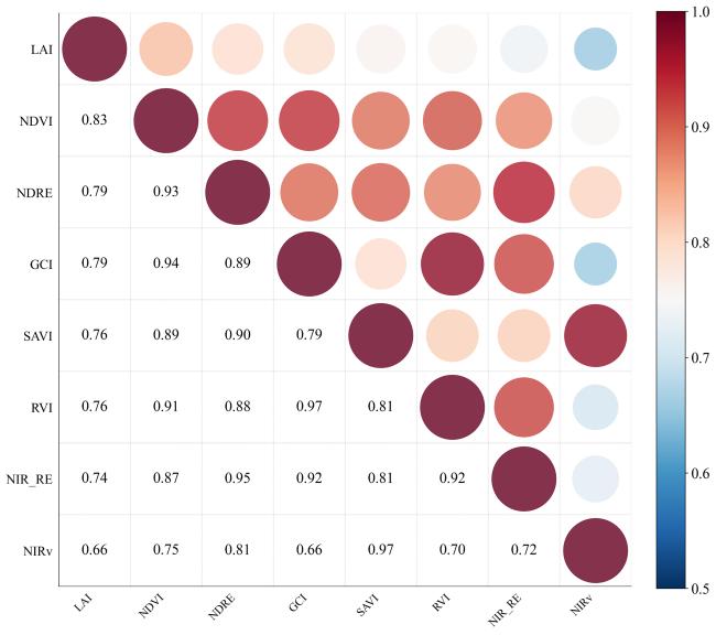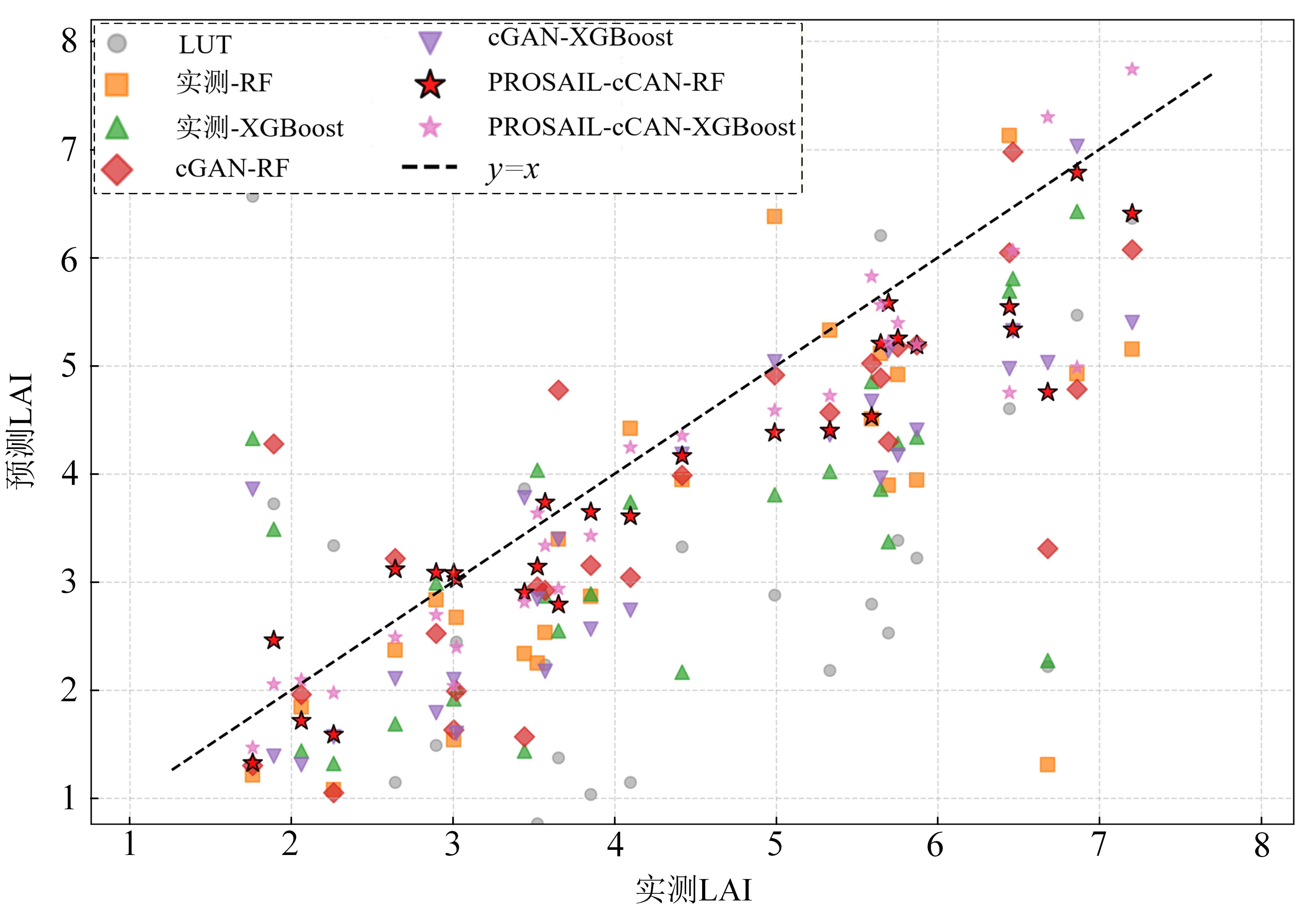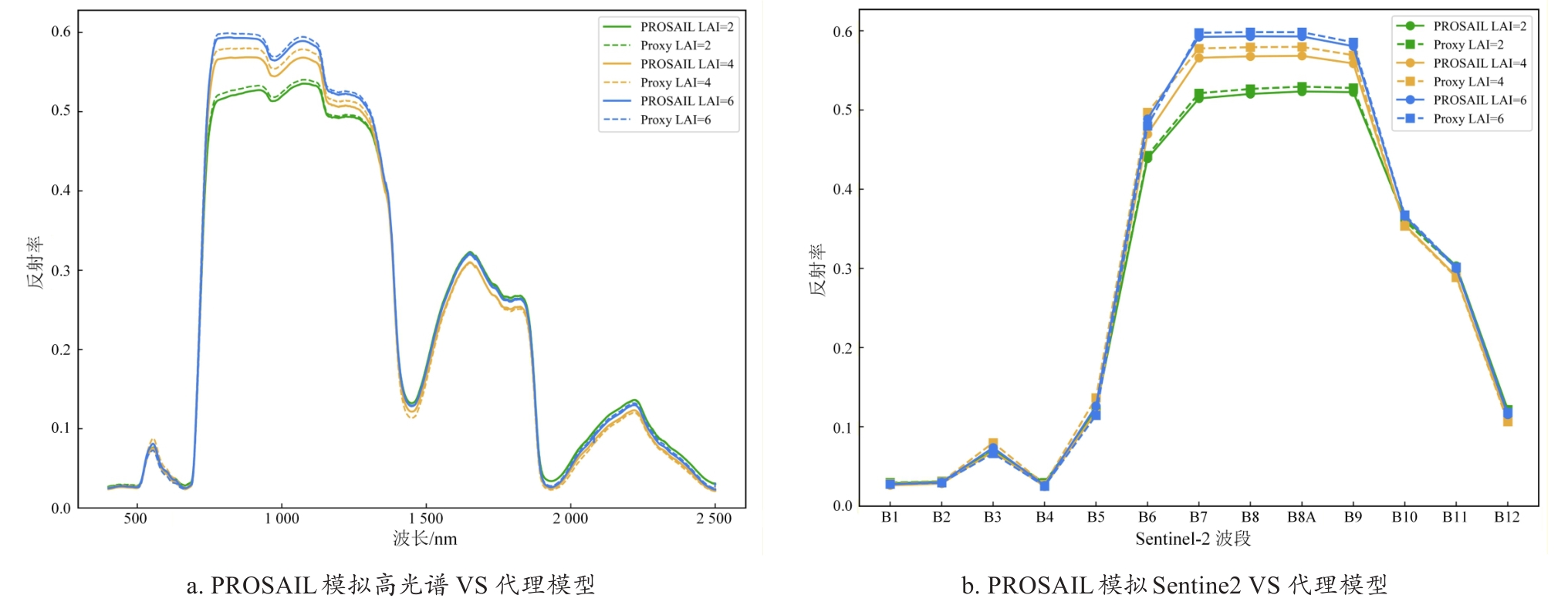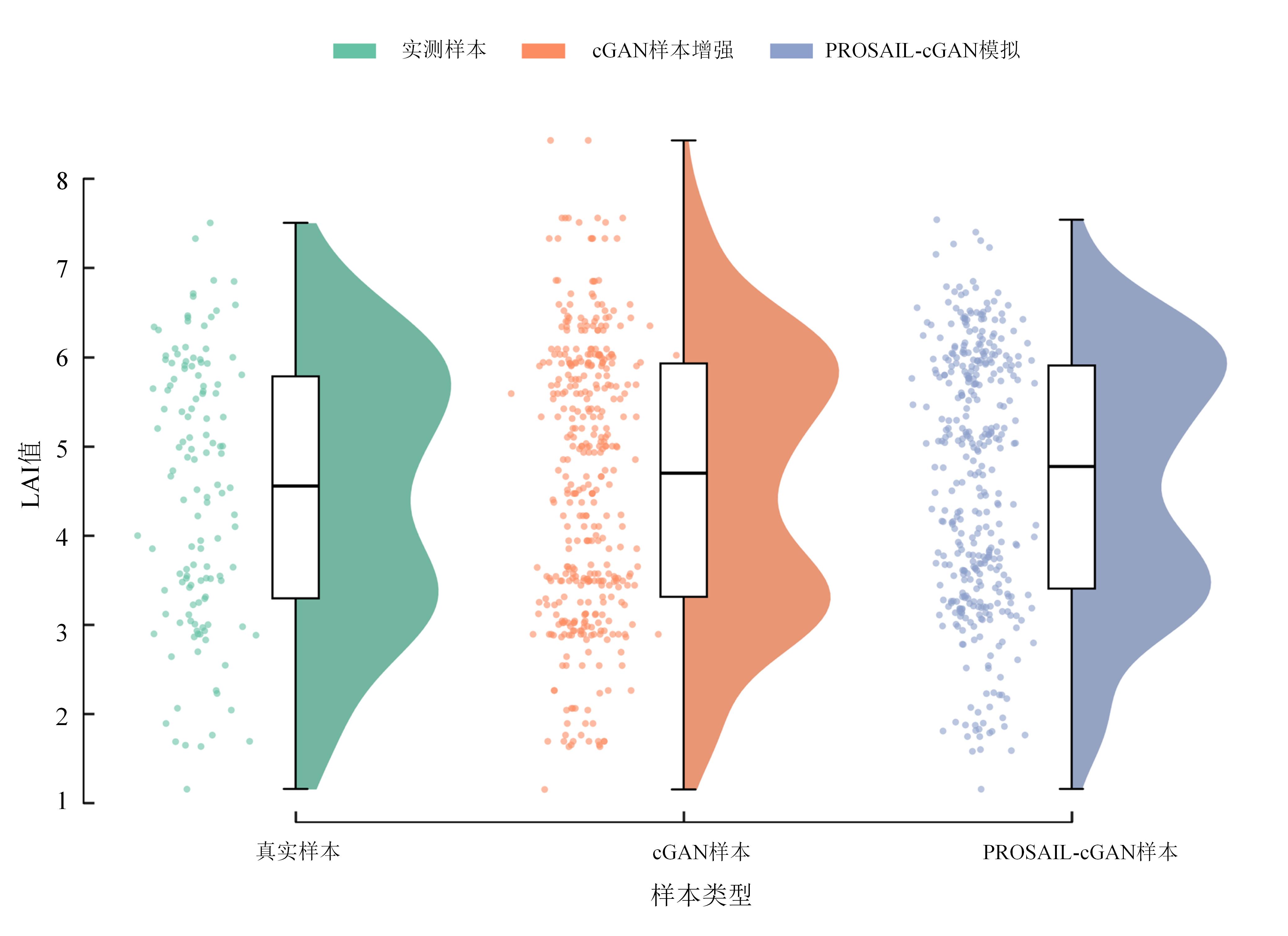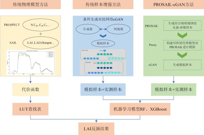 Objective The leaf area index (LAI) is a key biophysical parameter that reflects the canopy structure and photosynthetic capacity of crops. However, the inversion of winter wheat LAI from remote sensing data is often constrained by the limited availability of field measurements, leading to insufficient model generalization. Although radiative transfer model (RTM)-based simulations can expand the sample size, discrepancies between simulated and observed spectra persist due to simplified canopy and soil parameterizations. Conversely, purely data-driven generative models such as generative adversarial networks (GANs) can enhance sample diversity but often produce physically inconsistent samples in the absence of biophysical constraints. To address these issues, a physics-constrained PROSAIL-cGAN (conditional generative adversarial network) spectral sample augmentation method was proposed that integrated the PROSAIL model with cGAN to improve the accuracy and robustness of LAI inversion under small-sample conditions, generate physically realistic spectral-parameter pairs and provide reliable data support for remote sensing-based monitoring of winter wheat growth. Methods The study area was located in Zouping city, Shandong Province, a major winter wheat production region within the Huang-Huai-Hai Plain. A total of 133 field samples were collected during the jointing stage in April 2025 using an LAI-2200C canopy analyzer, with synchronous canopy spectra acquired. A Sentinel-2A Level-2A image from April 15, 2025, served as the remote sensing source, comprising 13 bands resampled to a spatial resolution of 10 m. The dataset was divided into training (70%) and validation (30%) subsets, with LAI values ranging from 1.646 to 7.505. The proposed method combined the PROSAIL radiative transfer model with a conditional GAN framework. First, PROSAIL was employed to simulate canopy reflectance and corresponding biophysical parameters, including chlorophyll content (Cab), carotenoid content (Car), brown pigment content (Cbrown), equivalent water thickness (Cw), dry matter content (Cm), LAI, and leaf inclination distribution (LIDFa). A multi-layer perceptron (MLP) surrogate model was then trained to approximate the forward mapping of PROSAIL, enabling differentiability for integration with deep learning architectures. The cGAN generator received random noise and physical parameters as conditional inputs to produce corresponding canopy reflectance, while the discriminator jointly evaluated authenticity and physical consistency. During adversarial training, physical constraints were incorporated into the generator's loss function to ensure biophysical realism. The generated samples were subsequently filtered based on parameter ranges and discriminator confidence scores. Kernel density overlap between real and generated LAI distributions was used to quantify their statistical consistency. Finally, the enhanced dataset was used to train random forest (RF) and extreme gradient boosting (XGBoost) regression models for the LAI inversion. Model performance was assessed using the coefficient of determination (R2), root mean square error (RMSE), and mean absolute error (MAE), and compared with three baselines: 1) field-measured modeling, 2) the PROSAIL lookup table (LUT) method, and 3) cGAN-only augmentation. Results and Discussions The surrogate MLP model accurately reproduced PROSAIL-simulated spectra, achieving R2 0.817, RMSE 0.008 5, and MAE 0.005 5, confirming its feasibility as a differentiable physical proxy. The cGAN-based augmentation achieved a LAI distribution overlap of 0.806 with the measured samples, whereas the PROSAIL-cGAN improved the overlap to 0.827, demonstrating enhanced physical realism and sample diversity. Model comparisons revealed substantial differences in performance. The LUT-based inversion yielded only R2 0.353 0 and RMSE 1.284 0, reflecting its limited adaptability to spectral heterogeneity. Direct regression using field data improved accuracy (R2=0.680 1 for XGBoost and 0.648 8 for RF). Incorporating cGAN-generated samples further enhanced model accuracy (R2 0.745 0 for RF and 0.739 0 for XGBoost). The PROSAIL-cGAN-enhanced RF model achieved the best overall performance, with R2 0.848 8, RMSE 0.540 9, and MAE 0.293 7. The sample-size sensitivity analysis demonstrated that as the number of field samples increased from 27 to 106, R2 improved from 0.546 2 to 0.848 8 and RMSE decreased from 1.024 3 to 0.540 9. When the sample size exceeded 79, model performance stabilized, indicating strong robustness. Spatial mapping results showed that LAI values were higher in the central and northern regions (4~7) and lower in the southern mountainous areas (1.5~4), consistent with variations in soil fertility and field management practices. These findings validate the model's applicability for regional-scale monitoring of crop growth. Conclusions This study developed a physics-constrained PROSAIL-cGAN spectral sample augmentation method for winter wheat LAI inversion. By integrating a radiative transfer model, a conditional generative network, and a differentiable surrogate, the method effectively generated physically consistent and diverse spectral-parameter samples under small-sample conditions. The PROSAIL-cGAN-based RF model achieved a relatively high inversion accuracy, outperforming traditional LUT and field-only approaches. The proposed method successfully mitigated small-sample limitations, ensured physical interpretability, and improved model generalization. It provides a robust framework for the remote sensing inversion of crop canopy parameters, supporting precision agriculture and dynamic monitoring of crop growth. Future work will focus on optimizing sample generation strategies, integrating multi-temporal satellite data and additional physiological parameters, and coupling with deep or semi-supervised learning techniques to further enhance scalability and applicability across crops and