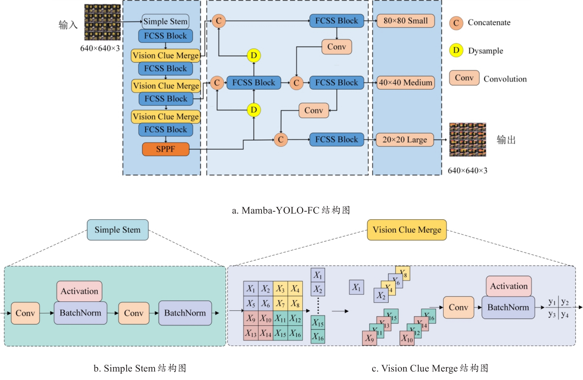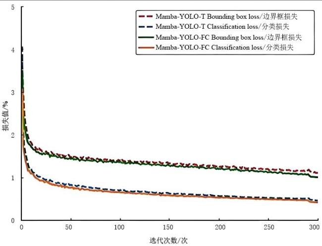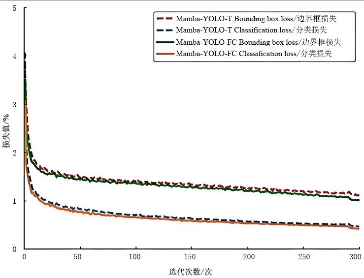 [Objective] Pears are a common fruit rich in vitamins and minerals. Traditional pear grading primarily relies on manual inspection, which is not only laborious but also susceptible to subjective factors, leading to unstable and inaccurate results. Furthermore, manual operations may cause varying degrees of physical damage to pears, affecting their appearance and market value. Therefore, developing an automated, efficient, and reliable pear grading technology has become an urgent demand in the industry. To address the current problem of poor detection accuracy caused by the small scale of surface defects in dangshan pears, a lightweight high-precision model is proposed based on an improved Mamba-YOLO architecture, aiming to balance detection accuracy and efficiency. [Methods] To enhance model training precision and generalization capability, images with poor pixel quality or blurriness were manually removed. The final dataset comprised 1 000 images, which were partitioned into training, validation, and test sets in an 8:1:1 ratio. Additionally, data augmentation techniques, including rotation, cropping, mirroring, and brightness adjustment, were applied to the dataset to improve training effectiveness. The following improvements were made to the network architecture. Firstly, a dynamic upsampling (Dysample) module was adopted. Compared to the existing upsampling module in Mamba-YOLO, the Dysample module featured fewer parameters and floating-point operations (FLOPs). Its design eliminated complex dynamic convolution kernels, requiring only a small number of linear layers and grouping operations, thereby preserving computational efficiency while enhancing the retention of defect details. Secondly, regarding pear surface defect detection, defects often exhibited high-frequency local features, whereas traditional convolutional neural networks (CNNs) suffered from insufficient feature capture and imbalanced frequency response. As the dilation rate increased, the frequency response of the convolution kernel decreased and its bandwidth narrowed, consequently limiting its ability to process high-frequency information. Therefore, a frequency-adaptive dilated convolution (FADC) module was proposed, which dynamically adjusted the convolution kernel size, enabling the network to adaptively select matching kernels based on local input features. Smaller kernels were used in high-frequency regions, and larger kernels in low-frequency regions, thereby achieving collaborative optimization of multi-band features and enhancing the ability to extract defect features. Finally, considering that using only single-scale depthwise convolutions to capture local features might lead to insufficient perception of input feature information, and that traditional gating mechanisms may lack adequate global context information modeling, the squeeze-and-excitation (SE) module was fused with a channel mixer based on the convolutional gated linear unit (CGLU). This combination was extended into a multi-scale version termed MS-CGLU. By incorporating convolutional kernels of different sizes to extract multi-scale features, followed by weighted fusion, stronger feature representation was achieved. [Results and Discussions] The proposed algorithm was rigorously evaluated on the dangshan pear test set. Ablation experiments demonstrated that introducing the CGLU, FADC, and Dysample enhanced detection performance, confirming the effectiveness of these modules. Compared to YOLOv8n, Gold-YOLO-N, and YOLOv12n, the mean average precision (mAP) was higher by 4.7, 5.3, and 6.3 percent points, respectively. Compared to the baseline Mamba-YOLO-T, the mAP increased by 3.4 percent points and the frames per second (FPS) improved by 10.8 percent points. Furthermore, in comparative experiments with larger-scale models from the same Mamba-YOLO series, the proposed algorithm still demonstrated significant advantages, i.e., its parameter count was only 41.7% of Mamba-YOLO-B and 15.7% of Mamba-YOLO-L, and its FLOPs was merely 57.1% and 18.1% of the respective models, yet it achieved increases in mAP@0.5 of 3.2% and 1.4%, and increases in mAP@0.5:0.95 of 3.1% and 2.6%, respectively. [Conclusions] This study successfully developed a high-precision and lightweight algorithm for detecting surface defects on dangshan pears. It achieved a superior balance between detection accuracy and inference speed, significantly outperforming relevant lightweight benchmarks and even larger models within its own family in terms of efficiency. This work can provide reliable algorithmic support for lightweight detection research of pear surface defects.