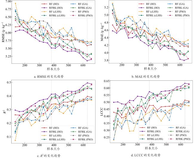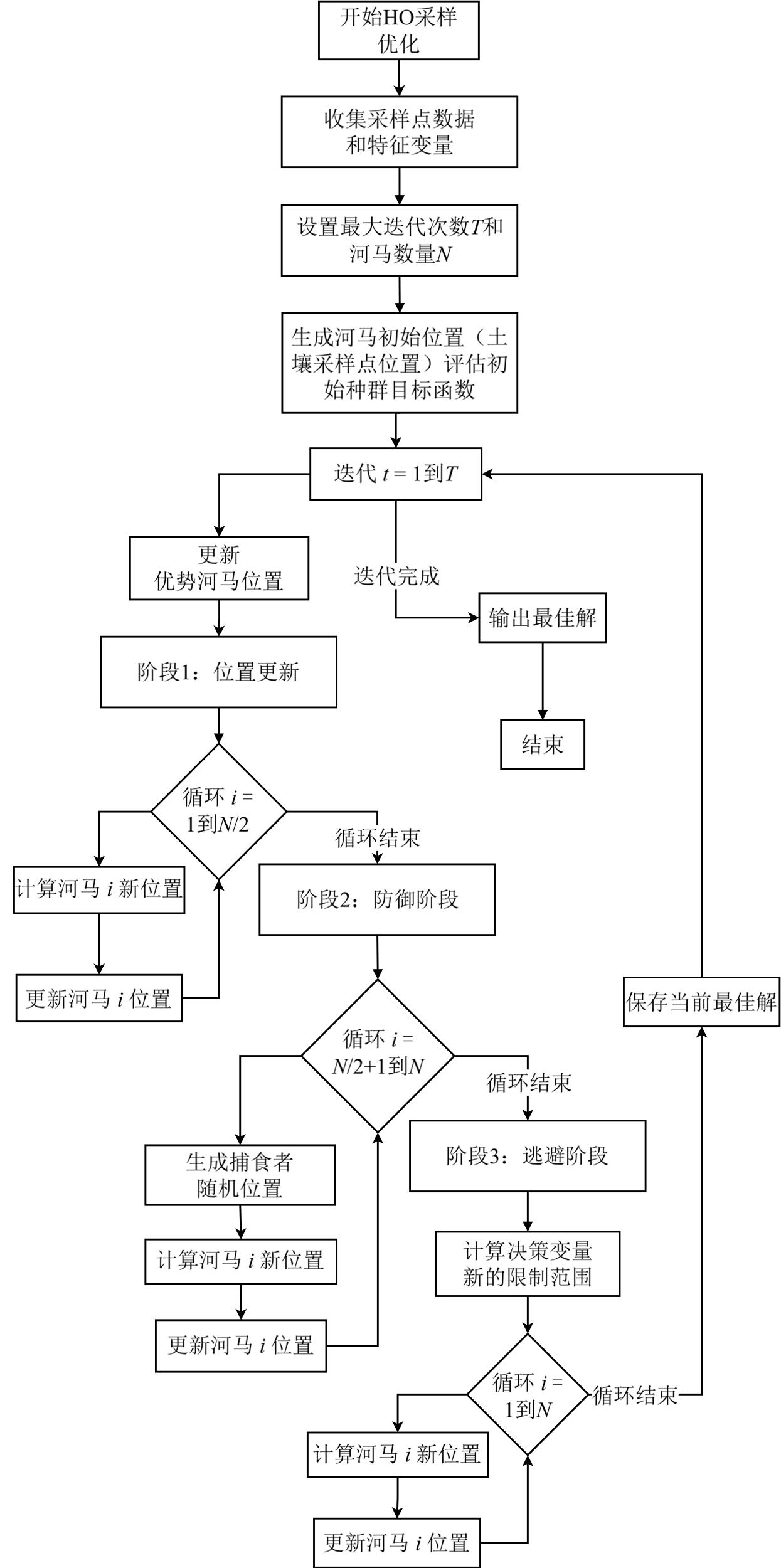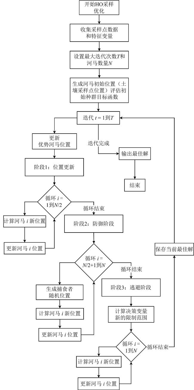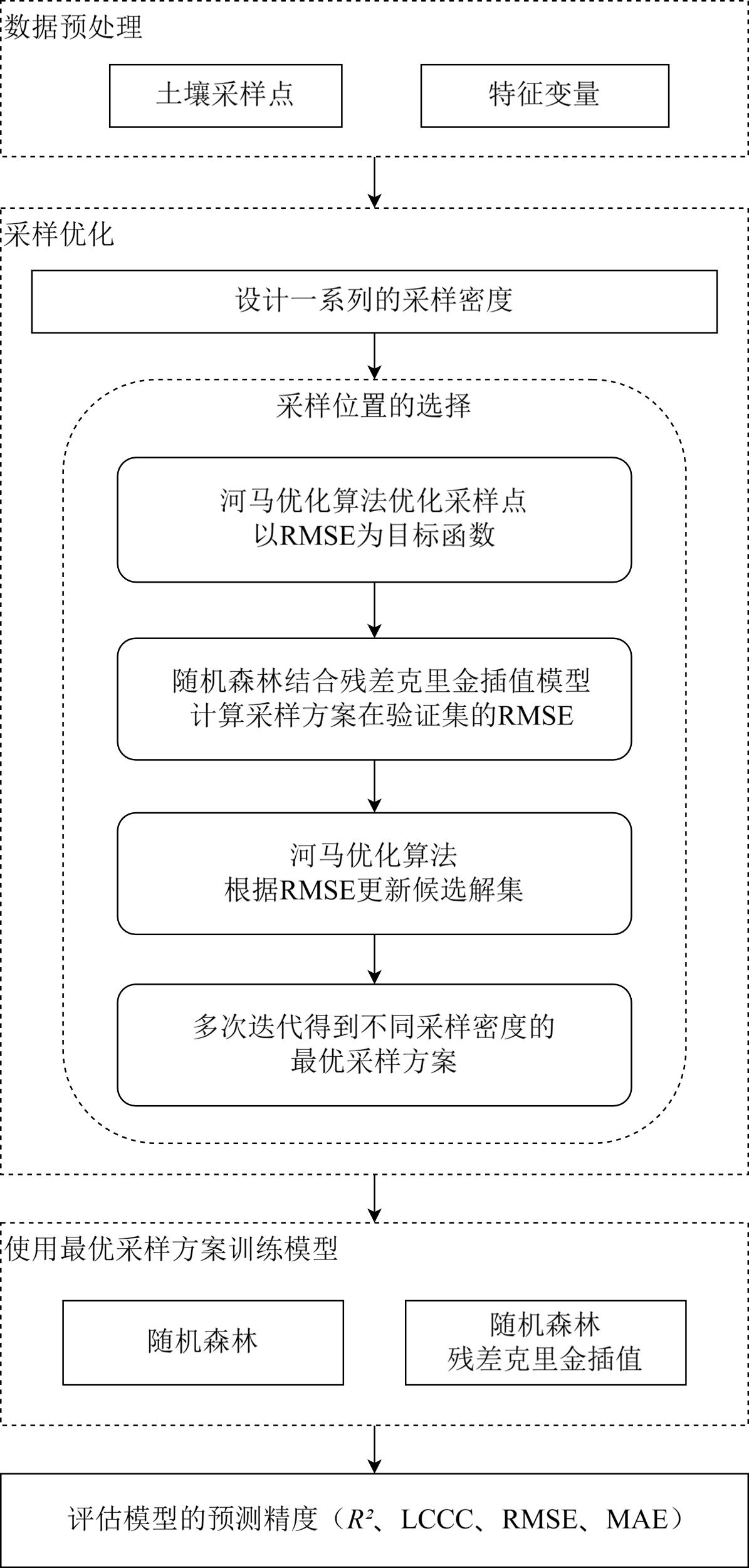 [Objective] Soil quality is crucial for food security, ecosystem health, and sustainable development, but faces degradation due to intensive land use. Accurate soil quality assessment is therefore essential for informed land management and ecological protection. Machine learning has enhanced digital soil mapping (DSM) by improving modeling accuracy through multi-source data integration. Within DSM, soil sampling design is a foundational step that directly influences prediction accuracy, cost, and efficiency. An ideal scheme must balance mapping precision with economic and operational feasibility. This study focuses on soil organic matter (SOM), a core indicator of soil quality affecting fertility, carbon sequestration, and environmental regulation. Precisely mapping its spatial variability is vital for sustainable soil management. To address the need for efficient sampling, the aim is to develop an optimal sampling design method for regional-scale SOM mapping. The objective is to reduce sampling redundancy and cost while improving spatial prediction accuracy. [Methods] A sampling optimization framework was proposed that integrated intelligent optimization algorithms with a hybrid spatial interpolation model. The framework was built upon the hippopotamus optimization algorithm (HO) and incorporated the random forest residual kriging (RFRK) method to construct an optimal sampling strategy for the spatial prediction of SOM. At the initialization stage, a population of candidate solutions—referred to as 'hippopotamuses'—was randomly generated, with each individual representing a potential sampling layout. In this study, the HO was employed to select subsets of sampling points from the training sample pool, with each subset forming a candidate solution. Collectively, these solutions constituted the initial hippopotamus population. The study area was located in Lanxi city, Zhejiang province, where a total of 1 080 field-measured soil samples were collected. These samples were partitioned into a training set (n=756), a validation set (n=108), and a test set (n=216) at a ratio of 7:1:2. Environmental covariates—including terrain attributes, vegetation indices, and climate factors—were extracted from multi-source remote sensing datasets. Using these covariates, the HO optimized sampling schemes across varying densities and spatial configurations. The resulting designs were then evaluated using the RFRK model to assess their SOM prediction performance. This process enabled the identification of the optimal sampling density and spatial layout that balanced accuracy and cost-efficiency. [Results and Discussions] When the HO-RFRK framework was applied, the prediction accuracy of SOM improved significantly as sampling density increased from 0.5 to 2.3 points/km2 (136-629 points). The root mean square error (RMSE) on the test set decreased from 6.04 to 5.11 g/kg, representing a reduction of approximately 15.4%. The lowest prediction errors were observed at a sampling density of 2.3 points/km2, with the RMSE and mean absolute error (MAE) reaching their minimum values of 5.11 and 3.79 g/kg, respectively, beyond which further increases yielded only marginal gains, indicating diminishing returns. To assess the effectiveness of HO, its performance was compared with three established methods: conditioned Latin hypercube sampling (cLHS), genetic algorithm (GA), and particle swarm optimization (PSO). At lower densities (0.5-1.3 points/km2), all methods showed limited predictive power. However, at 1.4 points/km2 (383 points), the HO method was the first to exceed predefined accuracy thresholds (coefficient of determination, R2>0.40; Lin's concordance correlation coefficient, LCCC>0.55), achieving R2=0.41 and LCCC=0.57, outperforming cLHS (R²=0.38, LCCC=0.53), GA (R2=0.39, LCCC=0.52), and PSO (R2=0.38, LCCC=0.51). Across the range of 1.4-2.3 points/km2, HO consistently delivered superior results. At 2.3 points/km², the HO-RFRK combination achieved R2=0.49 and LCCC=0.63, surpassing cLHS, GA, and PSO in both metrics. [Conclusions] Based on the cultivated land of Lanxi city as a test case, a novel sampling optimization strategy is proposed based on the HO. First, the strategy successfully identified an optimal sampling density that maximizes prediction accuracy, as well as a lower, cost-effective density that maintains robust predictive performance with substantially reduced survey costs, defining a practical density range that balances precision and economic feasibility. Second, the RFRK model consistently demonstrated superior prediction accuracy compared to the standard random forest (RF) model across all tested sampling schemes, validating the effectiveness of the integrated HO-RFRK approach. In summary, this optimized strategy achieves high mapping accuracy with greater sampling efficiency, offering a scientifically grounded and practical methodology for reducing long-term soil monitoring costs. It provides a valuable reference for optimizing soil surveys in Lanxi city and other regions with similar environmental settings.