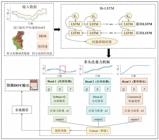 [Objective] The first flowering date of apples is a key phenological stage in the annual growth cycle of fruit trees. Its occurrence timing is directly associated with pollination efficiency, fruit set rate, and subsequent fruit development, and it also serves as an important basis for orchard management practices, including flower and fruit thinning, pest and disease control, as well as risk early warning and emergency management for low-temperature frost events during the flowering period. Existing studies still have room for improvement in the fine-scale extraction of temperature time-series information and in the representation of model adaptability across different spatial locations. Therefore, this study aimed to develop a prediction method for the first flowering date of apples that can effectively characterize time-varying temperature patterns and achieve regional adaptability, thereby providing more reliable technical support for refined orchard management and disaster prevention. [Methods] A deep learning–based forecasting framework for predicting the first flowering date of apples was developed based on observation sites in Luochuan County, Shaanxi Province. First, daily near-surface air temperature (NSAT) data from 2019 to 2021 were collected for the period from apple harvest to the subsequent flowering season in the study area, including daily maximum, mean, and minimum temperatures. In addition, elevation, latitude, and longitude were introduced as static geographic factors, forming a combined input composed of dynamic temperature sequences and static spatial attributes. Second, in terms of model design, a bidirectional long short-term memory network (Bi-LSTM) was employed as the temporal encoder to learn bidirectional dependencies within the temperature time series. On this basis, a customized multi-head attention (MHA) mechanism was integrated, consisting of a local dependency head, a global trend head, and a cumulative feature head, which were designed to represent short-term pre-flowering temperature fluctuations, overall temperature trends, and cumulative temperature effects, respectively. This configuration enhanced the extraction of time-varying information across multiple temporal scales. The attention outputs were then fused with the static geographic factors, and the predicted first flowering date was generated through a regression layer, enabling regionally adaptive prediction. To ensure comparability of results, LSTM and Bi-LSTM models were simultaneously constructed as baseline models using identical data preprocessing and training procedures.Third, Bayesian optimization was applied for automatic hyperparameter tuning, during which key parameters—including learning rate, number of network layers, number of hidden units, regularization terms, and optimizers—were systematically searched, and the optimal configuration was selected based on validation performance. Finally, a cross-year validation strategy was adopted to evaluate model generalization ability: Data from 2019 to 2021 were used as the modeling dataset (training and validation), while the observed first flowering date in 2022 served as an independent test dataset. The predictive performance of all models was evaluated using three widely recognized metrics: root mean square error (RMSE), mean absolute error (MAE), and the correlation coefficient (R). [Results and Discussion] The proposed model achieved an RMSE of 1.34 d, a MAE of 1.13 d, and the R of 0.84 on the test dataset, with most prediction errors concentrated within a range of 0–2 d. Validation results indicated that the proposed approach was capable of providing stable predictions approximately 15–20 d in advance within the study area. Further comparative analysis demonstrated that the Bi-LSTM architecture more effectively exploited both forward and backward dependencies in the pre-flowering temperature time series, thereby offering a more stable temporal representation for regression-based prediction of the first flowering date. Building upon this structure, the introduction of three attention heads—the local dependency head, the global trend head, and the cumulative feature head—enabled the model to more explicitly distinguish and utilize short-term fluctuations, stage-wise trends, and cumulative temperature effects. This targeted extraction of multi-scale time-varying information contributed to reduced prediction errors and improved overall prediction accuracy. Ablation experiments involving static geographic factors further verified the necessity of the spatial adaptability component. When elevation was removed, the RMSE increased from 1.34 d to 1.45 d. Removing latitude and longitude led to a larger increase in RMSE to 2.54 d, and when both elevation and geographic coordinates were excluded, the RMSE further rose to 2.69 d accompanied by a decrease in correlation. These results indicated that geographic factors provided effective spatial constraints, which supported the learning of location-specific phenological responses across different sampling sites. In addition, spatial prediction maps revealed that the first flowering date in the study area exhibited a gradient distribution with respect to elevation to a certain extent. This spatial pattern was consistent with the modeling rationale of incorporating geographic factors into a unified prediction framework. [Conclusion] This study proposes a deep learning-based prediction method for the first flowering date of apples that integrates multi-dimensional temperature features, a multi-head attention mechanism, and geographic factors. The proposed method achieves relatively high prediction accuracy in cross-year forecasting and enables spatially adaptive prediction of the first flowering date of apples. These findings provide a new data-driven technical pathway for refined prediction of apple flowering phenology and offer important technical support for orchard flowering managemen