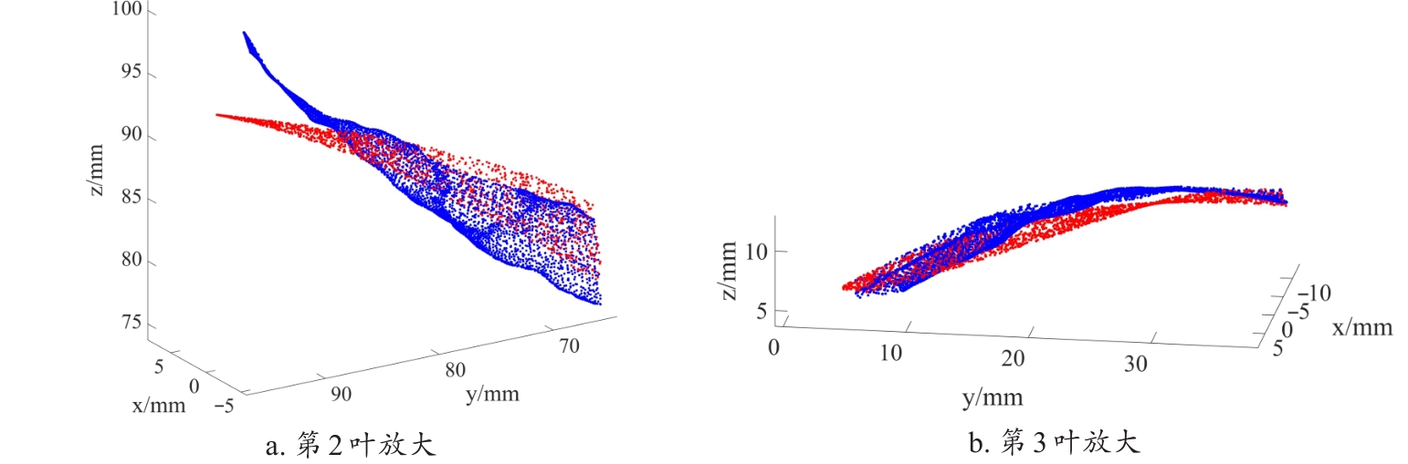 [Objective] Plant leaf shape is an important part of plant architectural model. Establishment of a three-dimensional structural model of leaves may assist simulating and analyzing plant growth. However, existing leaf modeling approaches lack interpretability, invertibility, and operability, which limit the estimation of model parameters, the simulation of leaf shape, the analysis and interpretation of leaf physiology and growth state, and model reusage. Aiming at the interoperability between three-dimensional structure representation and mathematical model parameters, this study paid attention to three aspects in wheat leaf shape parametric reconstruction: (1) parameter-driven model structure, (2) model parameter inversion, and (3) parameter dynamic mapping during growth. Based on this, a set of parameter-driven and point cloud inversion model for wheat leaf interoperability was proposed in this study. [Methods] A parametric surface model of a wheat leaf with seven characteristic parameters by using parametric modeling technology was built, and the forward parametric construction of the wheat leaf structure was realized. Three parameters, maximum leaf width, leaf length, and leaf shape factor, were used to describe the basic shape of the blade on the leaf plane. On this basis, two parameters, namely the angle between stems and leaves and the curvature degree, were introduced to describe the bending characteristics of the main vein of the blade in the three-dimensional space. Two parameters, namely the twist angle around the axis and the twist deviation angle around the axis, were introduced to represent the twisted structure of the leaf blade along the vein. The reverse parameter estimation module was built according to the surface model. The point cloud was divided by the uniform segmentation method along the Y-axis, and the veins were fit by a least squares regression method. Then, the point cloud was re-segmented according to the fit vein curve. Subsequently, the rotation angle was precisely determined through the segment-wise transform estimation method, with all parameters being optimally fit using the RANSAC regression algorithm. To validate the reliability of the proposed methodology, a set of sample parameters was randomly generated, from which corresponding sample point clouds were synthesized. These sample point clouds were then subjected to estimation using the described method. Then error analyzing was carried out on the estimation results. Three-dimensional imaging technology was used to collect the point clouds of Zhengmai 136, Yangmai 34, and Yanmai 1 samples. After noise reduction and coordinate registration, the model parameters were inverted and estimated, and the reconstructed point clouds were produced using the parametric model. The reconstruction error was validated by calculating the dissimilarity, represented by the Chamfer Distance, between the reconstructed point cloud and the measured point cloud. [Results and Discussions] The model could effectively reconstruct wheat leaves, and the average deviation of point cloud based parametric reconstruction results was about 1.2 mm, which had a high precision. Parametric modeling technology based on prior knowledge and point cloud fitting technology based on posterior data was integrated in this study to construct a digital twin model of specific species at the 3D structural level. Although some of the detailed characteristics of the leaves were moderately simplified, the geometric shape of the leaves could be highly restored with only a few parameters. This method was not only simple, direct and efficient, but also had more explicit geometric meaning of the obtained parameters, and was both editable and interpretable. In addition, the practice of using only tools such as rulers to measure individual characteristic parameters of plant organs in traditional research was abandoned in this study. High-precision point cloud acquisition technology was adopted to obtain three-dimensional data of wheat leaves, and pre-processing work such as point cloud registration, segmentation, and annotation was completed, laying a data foundation for subsequent research. [Conclusions] There is interoperability between the reconstructed model and the point cloud, and the parameters of the model can be flexibly adjusted to generate leaf clusters with similar shapes. The inversion parameters have high interpretability and can be used for consistent and continuous estimation of point cloud time series. This research is of great value to the simulation analysis and digital twinning of wheat leaves.