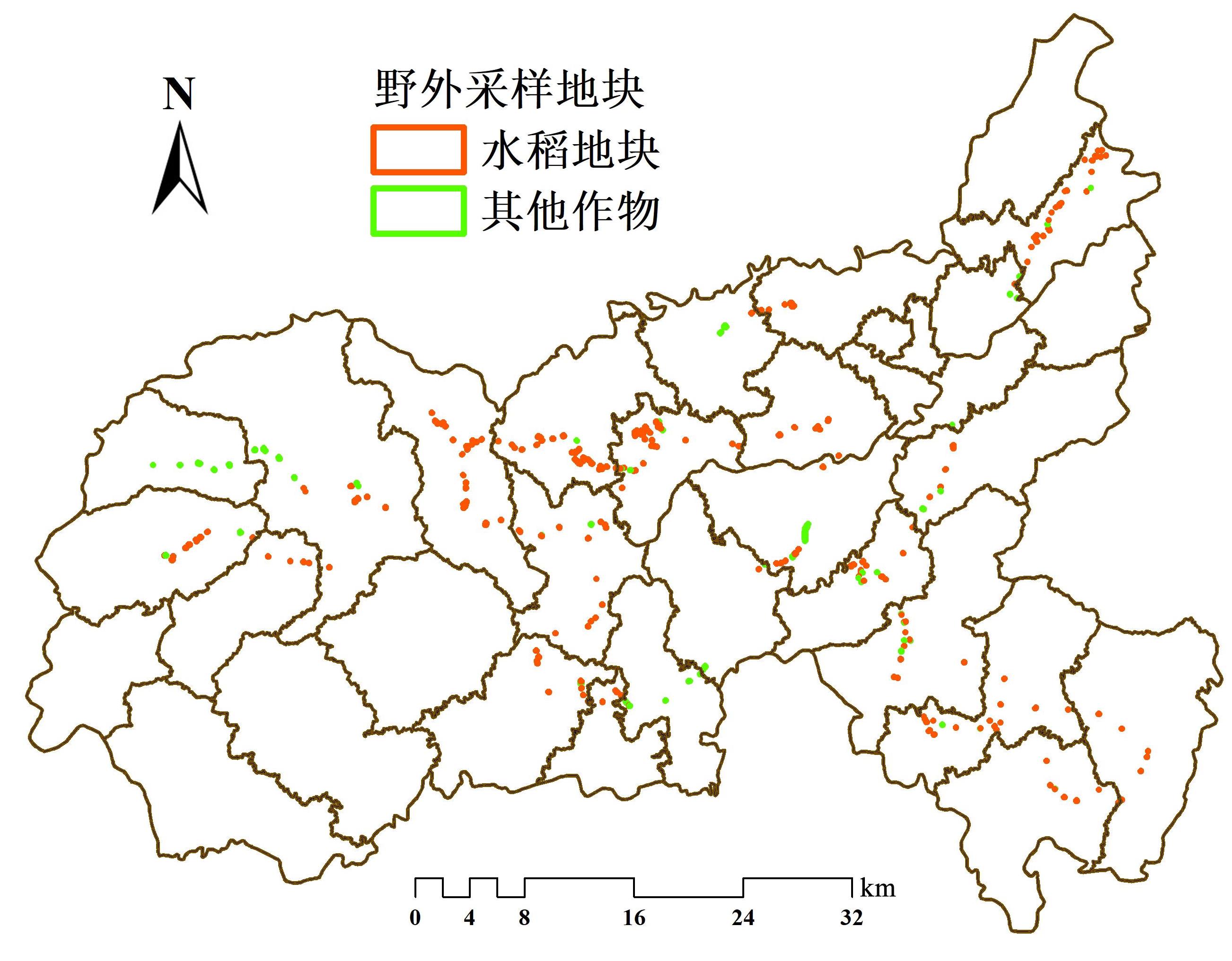 | 哨兵2号A星和哨兵2号B星(Sentinel 2A和2B) | 2023年7月、8月 | 2、3、4、8波段10 m;1、9、10波段60 m;5、6、7、11、12波段20 m | 早稻成熟期,中稻孕穗期 | 采样前初分类(早稻、中稻、晚稻) |