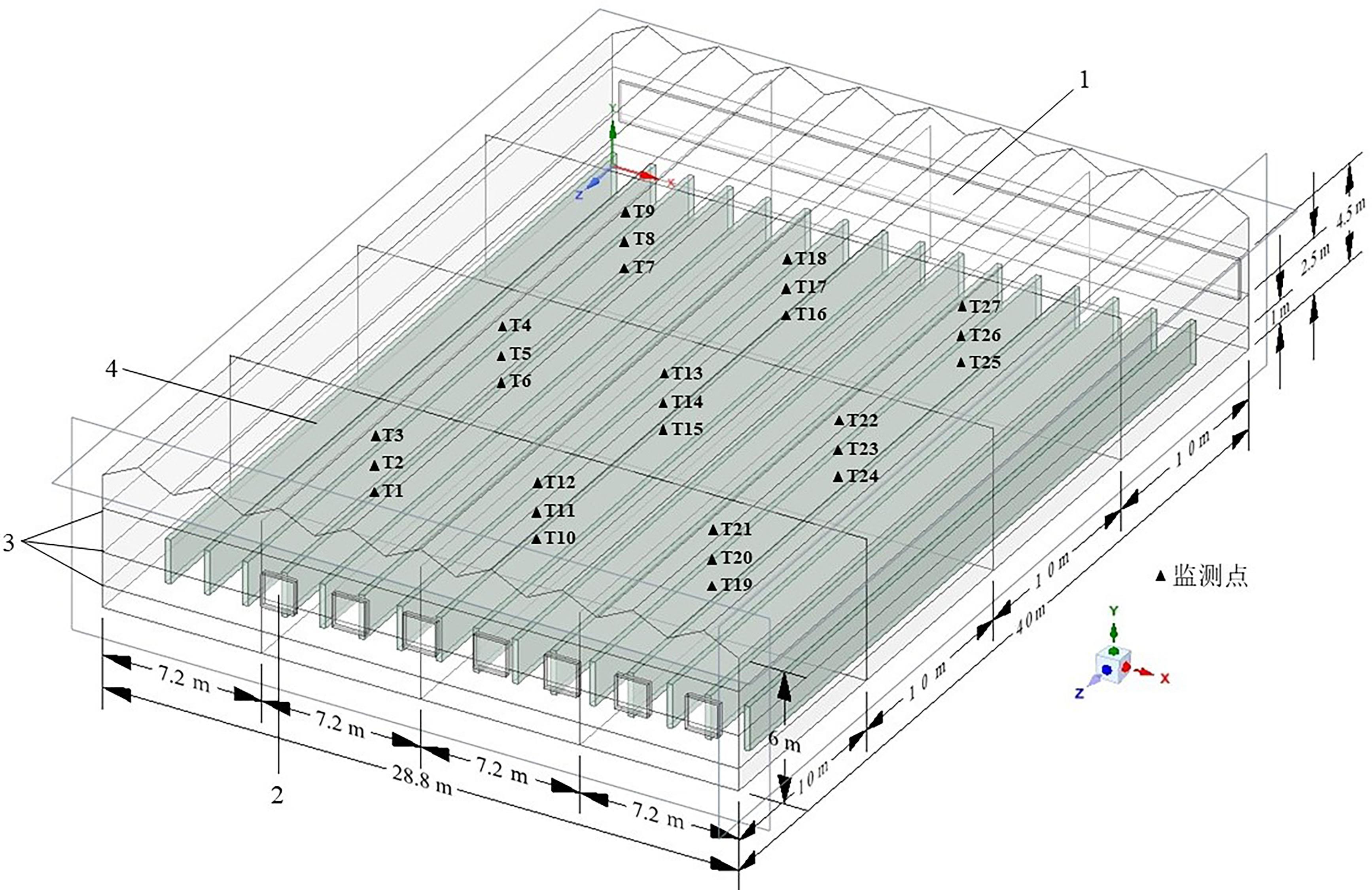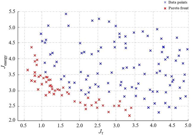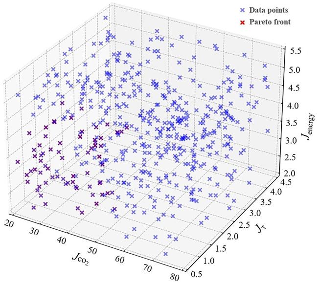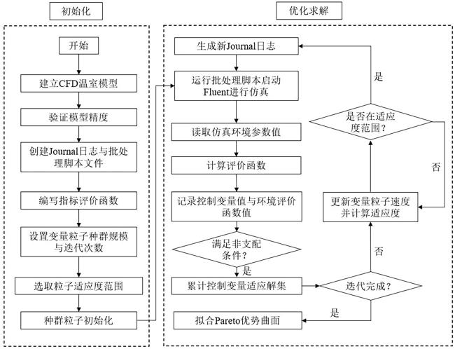 [Objective] In the context of modern agricultural practices, regulating the indoor microclimate of Venlo-type greenhouses during the summer months through mechanical ventilation remains a significant challenge. This is primarily due to the nonlinear dynamics and strong coupling characteristics inherent in greenhouse environmental systems, where variables such as temperature, humidity, and CO₂ concentration interact in complex, interdependent ways. Traditional control strategies, which often rely heavily on empirical knowledge and manual intervention, are insufficient to cope with such dynamic conditions. These approaches tend to result in imprecise control, substantial time delays in response to environmental fluctuations, and unnecessarily high energy consumption during ventilation operations. Therefore, this study combines computational fluid dynamics (CFD) model with a multi-objective particle swarm optimization (MOPSO) algorithm to establish a joint optimization framework, aiming to address the issues of significant time delays and excessive operational energy consumption caused by vague environmental control strategies in this scenario. [Methods] To build a reliable simulation and optimization framework, environmental parameters such as temperature, wind speed, and CO₂ concentration were continuously collected via a network of environmental monitoring sensors installed at various positions inside the greenhouse. These real-time data served as validation benchmarks for the CFD model and supported the verification of mesh independence. In the CFD model construction, the internal structure of the Venlo-type greenhouse was precisely reconstructed, and appropriate boundary conditions were set based on empirical data. The airflow dynamics and thermal field were simulated using a finite volume-based solver. Four grid resolutions were evaluated for grid independence by comparing the variations in output metrics. The controllable parameters in the model included fan outlet wind speed and cooling pad condensation temperature. These parameters were systematically varied within predefined ranges. To evaluate the greenhouse environmental quality and energy consumption under different control conditions, three custom-defined objective functions were proposed: temperature suitability, CO2 uniformity, and fan operating energy consumption. The MOPSO algorithm was then applied to conduct iterative optimization over the defined parameter space. At each step, the objective functions were recalculated based on CFD outputs, and Pareto-optimal solutions were identified using non-dominated sorting. After iterative optimization using the algorithm, the conflicting objectives of environmental deviation and energy consumption were balanced, leading to the optimal range for the greenhouse environmental control strategy in this scenario. [Results and Discussions] The experimental results showed that the environmental field simulation accuracy of the CFD model was high, with an average relative error of 5.7%. In the grid independence test, three grid types, coarse, medium, and fine, were selected. The variations in the grid divisions were 1.7% and 0.6%, respectively. After considering both computational accuracy and efficiency, the medium grid division standard was adopted for subsequent simulations. The optimization strategy proposed in this study allows for closed-loop evaluation of the environment. The algorithm set the population size to 100 particles, and within the specified range of fan outlet wind speed and cooling pad condensation temperature, each particle iterates 5 times for optimization. The position updated in each iteration was used to calculate the values of the three objective evaluation functions, followed by non-dominated comparison and adaptation of the solutions, until the optimization was complete. In the Pareto surface fitted by the output results, the fan outlet wind speed ranges from 2.8 to 5.4 m/s, and the inlet temperature ranges from 295.3 to 299.7 K. Since the evaluation functions under the environmental control strategy were all in an ideal, non-dominated state, two sets of boundary control conditions were randomly selected for simulation: operating Condition A [296 K, 3.5 m/s] and operating Condition B [299 K, 5 m/s]. Post-processing contour plots showed that both operating conditions achieve good environmental optimization uniformity. The approximate ranges for each parameter were: temperature from 300.3 to 303.9 K, wind speed from 0.7 to 2.3 m/s, and CO2 concentration from 2.43 × 10-5 to 3.56 × 10-5 kmol/m3. Based on environmental uniformity optimization, operating Condition A focused on adjusting the suitable temperature for crops by lowering the cooling pad condensation temperature, but there was a relative stagnation of CO2. Operating Condition B, by increasing the fan outlet wind speed, focused on regulating CO2 flow and diffusion, but the gradient change of airflow near the two side walls was relatively abrupt. [Conclusions] This study complements the research on the systematic adjustment of greenhouse environmental parameters, while its closed-loop iterative features also enhance the simulation efficiency. The simulation results show that by arbitrarily combining the optimal solution set within the theoretical range of the strategy output, optimization of the targeted objectives can be achieved by appropriately discarding other secondary objectives, providing a reference for regulating the uniformity and economy of mechanical ventilation in greenhouses. Subsequent research can further quantify the coupling effects and weight settings of each objective function to improve the overall optimization of the functions.