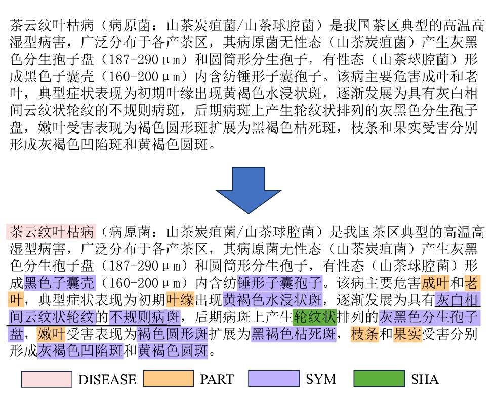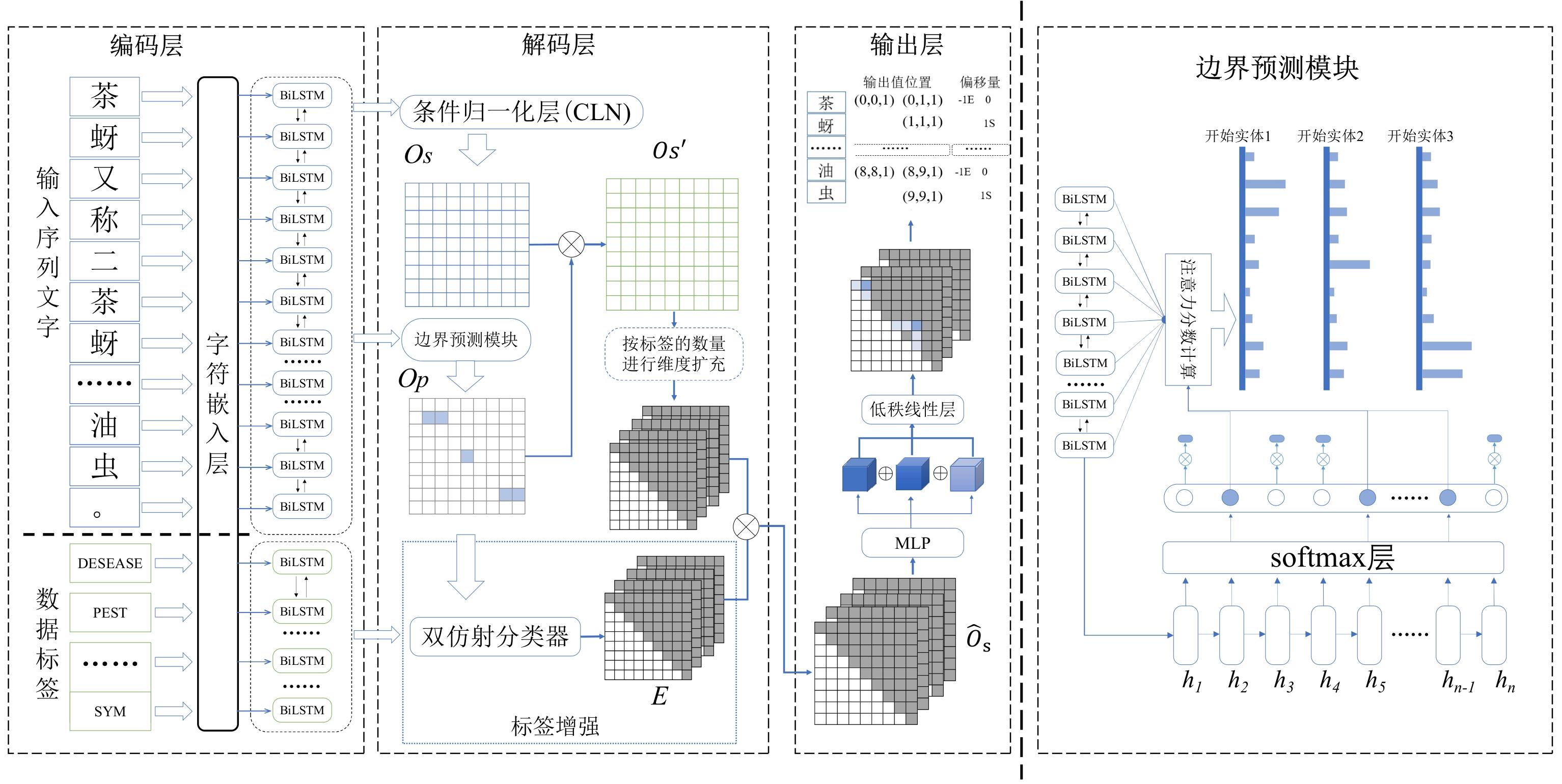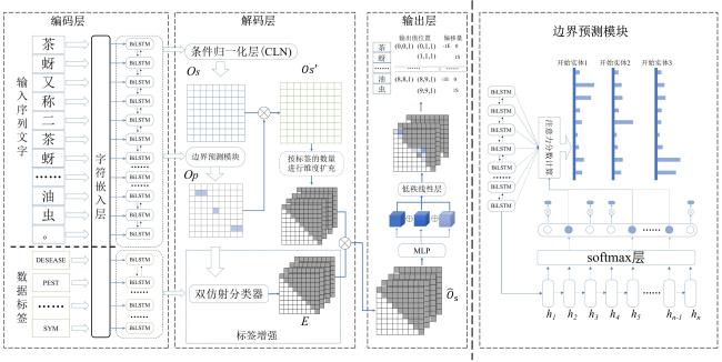 [Objective] Named entity recognition (NER) is vital for many natural language processing (NLP) applications, including information retrieval and knowledge graph construction. While Chinese NER has advanced with datasets like ResumeNER, WeiboNER, and CLUENER (Chinese language understanding evaluation NER), most focus on general domains such as news or social media. However, there is a notable lack of annotated data in specialized fields, particularly agriculture. In the context of tea pest and disease, this shortage hampers progress in intelligent agricultural information extraction. These domain-specific texts pose unique challenges for NER due to frequent nested and long-span entities, which traditional sequence labeling models struggle to handle. Issues such as boundary ambiguity further complicate accurate entity recognition, leading to poor segmentation and labeling performance. Addressing these challenges requires targeted datasets and improved NER techniques tailored to the agricultural domain. [Methods] The proposed model comprises two core modules specifically designed to enhance performance in BOPN (Boundary-Oriented and Path-aware Named Entity Recognition) tasks, particularly within domains characterized by complex and fine-grained entity structures, such as tea pest and disease recognition. The boundary prediction module was responsible for identifying entity spans within input text sequences. It employed an attention-based mechanism to dynamically estimate the probability that consecutive tokens belong to the same entity, thereby addressing the challenge of boundary ambiguity. This mechanism facilitated more accurate detection of entity boundaries, which was particularly critical in scenarios involving nested or overlapping entities. The label enhancement module further refines entity recognition by employing a biaffine classifier that jointly models entity spans and their corresponding category labels. This joint modeling approach enabled the capture of intricate interactions between span representations and semantic label information, improving the identification of long or syntactically complex entities. The output of this module was integrated with conditionally normalized hidden representations, enhancing the model's capacity to assign context-aware and semantically precise labels. In order to reduce computational complexity while preserving model effectiveness, the architecture incorporated low-rank linear layers. These were constructed by integrating the adaptive channel weighting mechanism of Squeeze-and-Excitation Networks with low-rank decomposition techniques. The modified layers replace traditional linear transformations, yielding improvements in both efficiency and representational capacity. In addition to model development, a domain-specific NER corpus was constructed through the systematic collection and annotation of entity information related to tea pest and disease from scientific literature, agricultural technical reports, and online texts. The annotated entities in the corpus were categorized into ten classes, including tea plant diseases, tea pests, disease symptoms, and pest symptoms. Based on this labeled corpus, a Chinese NER dataset focused on tea pest and disease was developed, referred to as the Chinese tea pest and disease dataset. [Results and Discussions] Extensive experiments were conducted on the constructed dataset, comparing the proposed method with several mainstream NER approaches, including traditional sequence labeling models (e.g., BiLSTM-CRF), lexicon-enhanced models (e.g., SoftLexicon), and boundary smoothing strategies (e.g., Boundary Smooth). These comparisons aimed to rigorously assess the effectiveness of the proposed architecture in handling domain-specific and structurally complex entity types. Additionally, to evaluate the model's generalization capability beyond the tea disease and pest domain, the study performed comprehensive evaluations on four publicly available Chinese NER benchmark datasets: ResumeNER, WeiboNER, CLUENER, and Taobao. Results showed that the proposed model consistently achieved higher F1-Scores improved across all used datasets: 0.68% on the self-built dataset, 0.29% on ResumeNER, 0.96% on WeiboNER, 0.7% on CLUENER, and 0.5% on Taobao. With particularly notable improvements in the recognition of complex, nested, and long-span entities. These outcomes demonstrate the model's superior capacity for capturing intricate entity boundaries and semantics, and confirm its robustness and adaptability when compared to current state-of-the-art methods. [Conclusions] The study presents a high-performance NER approach tailored to the characteristics of Chinese texts on tea pest and disease. By simultaneously optimizing entity boundary detection and label classification, the proposed method significantly enhanced recognition accuracy in specialized domains. Experimental results demonstrated strong adaptability and robustness of the model across both newly constructed and publicly available datasets, indicating its broad applicability and promising prospects.