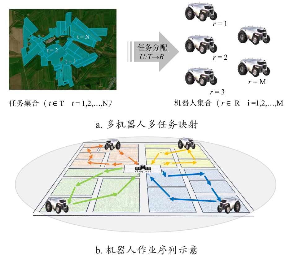 [Significance] With the deepening of intelligent agriculture and precision agriculture, the agricultural production mode is gradually transforming from traditional manual experience based operations to a modern model driven by data, intelligent decision-making, and autonomous execution. In this context, improving agricultural operation efficiency and achieving large-scale continuous and seamless operation coverage have become key requirements for promoting the modernization of agriculture. The multi robot full coverage operation technology, with its significant advantages in operation efficiency, system robustness, scalability, and resource utilization efficiency, provides practical and feasible intelligent solutions for key links such as sowing, plant protection, and harvesting in large-scale farmland. This technology, through the collaborative work of multiple robot systems, can not only effectively reduce the repetition rate of tasks and avoid omissions, but also achieve efficient and accurate continuous operations in complex and dynamic agricultural environments, greatly improving the automation and intelligence level of agricultural production. [Progress] Started from the global perspective of systems engineering, an integrated closed-loop technology framework of "perception decision execution" is constructed. It systematically sorts out and deeply analyzes the technological development status and research methods of each key link in the full coverage operation of agricultural multi robots. At the level of perception and recognition, focus on exploring the application of multi-source information fusion and collaborative perception technology. By integrating multi-source sensor data, multi-level fusion of data level, feature level, and decision level is achieved, and a refined global environment model is constructed to provide accurate crop status, obstacle distribution, and terrain information for the robot system. Especially in the field of multi robot collaborative perception, research has covered advanced models such as distributed SLAM and ground to ground collaboration. Through information sharing and complementary perspectives, the system's perception ability and modeling accuracy in wide area, unstructured agricultural environments have been improved. At the decision-making and planning level, three key aspects are analyzed: task allocation, global path planning, and local path adjustment. Task allocation has evolved from traditional deterministic methods to market mechanisms, heuristic algorithms, and intelligent methods that integrate reinforcement learning and graph neural networks to address the challenges of dynamic and complex resource constraints in agricultural scenarios. The global path planning system analyzed the characteristics of geometric decomposition, grid method, global planning, and learning methods in terms of path redundancy, computational efficiency, and terrain adaptability. Local path planning emphasizes the combination of real-time perception in dynamic environments, using methods such as graph search, sampling optimization, model predictive control, and end-to-end reinforcement learning to achieve real-time obstacle avoidance and trajectory smoothing. At the control execution level, the focus is on model-based trajectory tracking and control technology, aiming to accurately convert planned paths into robot motion. Traditional control methods such as PID, LQR, sliding mode control, etc. are continuously optimized to cope with terrain undulations and system disturbances. In recent years, intelligent methods such as fuzzy control, neural network control, reinforcement learning, and multi machine collaborative strategies have been gradually applied, further improving the control accuracy and collaborative operation capability of the system in dynamic environments. [Conclusions and Prospects] The closed-loop technical framework is systematically constructed for agricultural multi robot full coverage operations, and in-depth analysis of key modules are conducted, providing some understanding and suggestions, and providing theoretical references and technical paths for related research. However, the technology still faces many challenges, including perceptual uncertainty, dynamic changes in tasks, vast and irregular work areas, unpredictable dynamic obstacles, communication and collaboration barriers, and energy endurance issues. In the future, this field will further strengthen the integration with artificial intelligence, the Internet of Things, edge computing and other technologies, focusing on promoting the following directions, including the development of intelligent dynamic task allocation mechanism; Optimize global and local path planning algorithms to enhance their efficiency and adaptability in large-scale complex scenarios; Enhance the real-time perception and response capability of the system to dynamic environments; Promote software hardware collaboration and intelligent system integration to achieve efficient communication and integrated task management; Develop high-efficiency power systems and intelligent energy consumption strategies to ensure long-term continuous operation capability. Through these efforts, agricultural multi robot systems will gradually achieve higher levels of precision, automation, and intelligence, providing key technological support for the transformation of modern agriculture.