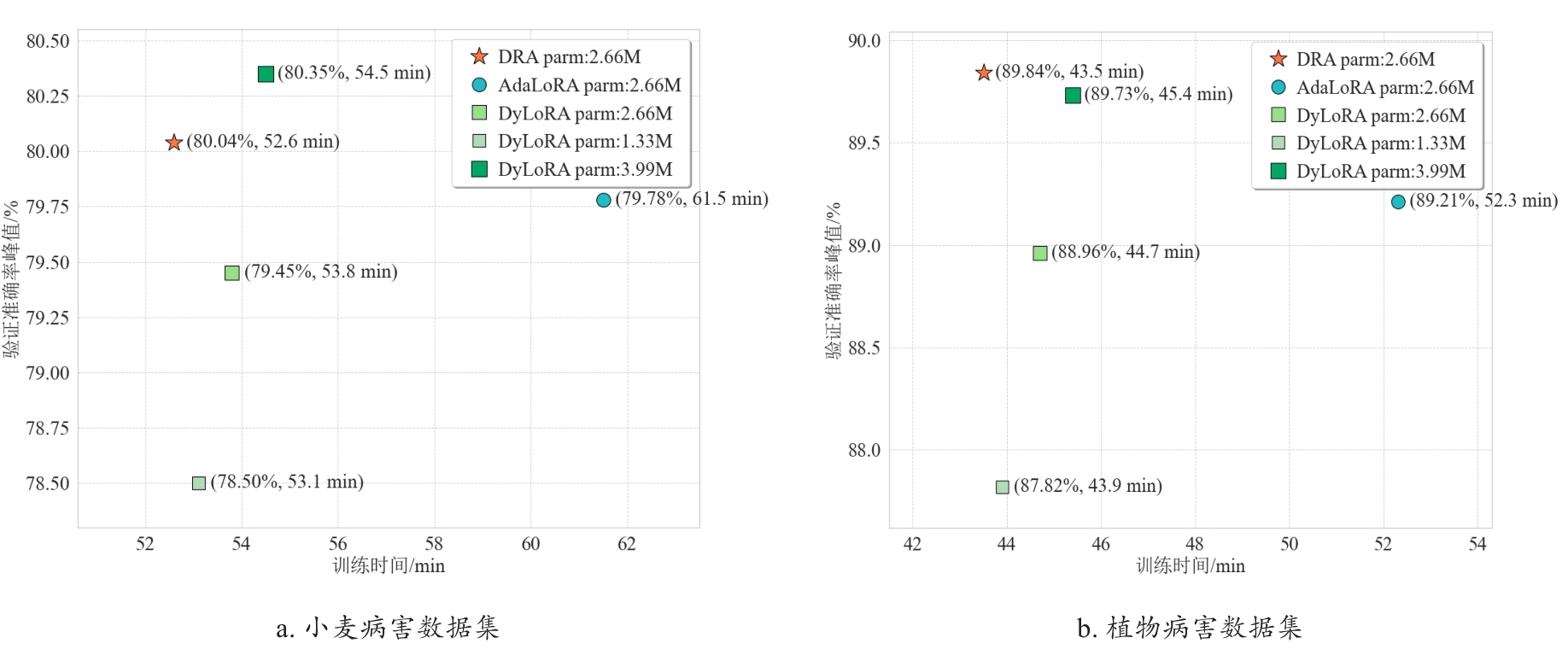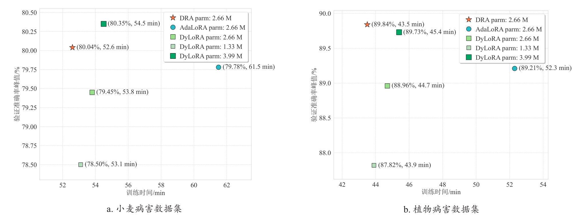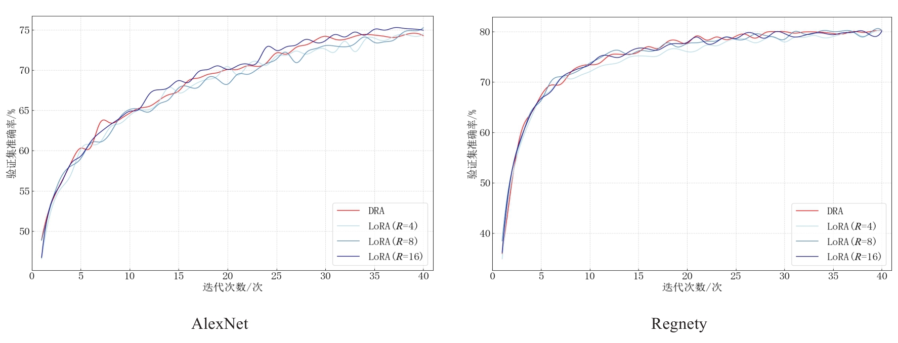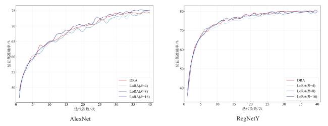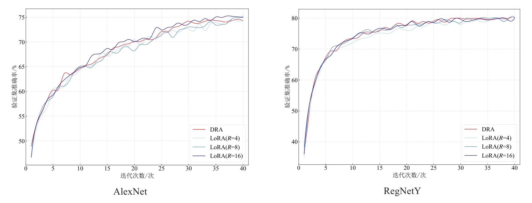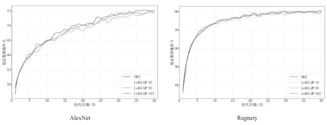 图4 AlexNet和RegNetY模型DRA与LoRA微调验证集准确率Fig. 4 Comparison of validation accuracy for AlexNet and RegNetY models under DRA and LoRA fine-tuning |