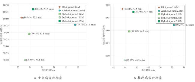 表7 DRA、AdaLoRA和DyLoRA方法的微调性能与参数预算对比Table 7 Comparison of fine-tuning performance and parameter budget among DRA, AdaLoRA, and DyLoRA methods |