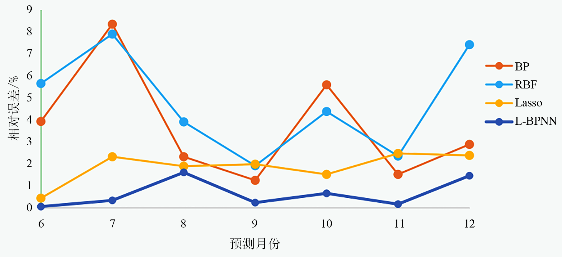 | Fig. 3 Comparison of the relative error of the prediction results between the L-BPNN model and the other three models |