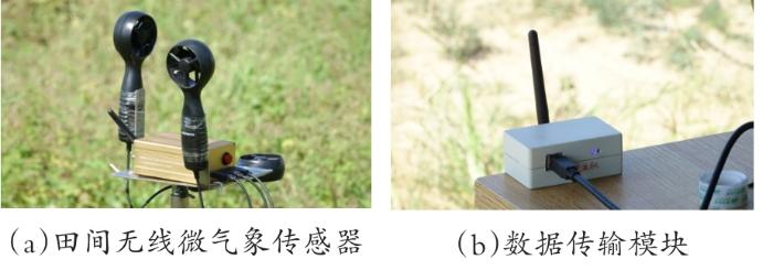 本试验采用MMMS(广州市富民测控科技有限公司制造)采集多旋翼无人机飞行状态下旋翼下洗气流风速,MMMS由田间无线微气象传感器和智能控制系统组成[20]。田间无线微气象传感器(图1(a))可固定在不锈钢支架上放置在试验区域内,每个传感器上最多可安装空间3个方向的叶轮和温湿度探头,获取水平沿无人机航线方向(X)、水平垂直于航线方向(Y)、竖直方向(Z)的气流风速;智能控制系统包括数据传输模块(图1(b))、控制软件和笔记本电脑,数据传输模块连接在笔记本电脑上,测试中操作控制软件经数据传输模块即可向传感器发送指令,自动接收回传的风速数据,所有数据可在控制软件中查看与保存。MMMS风速测量范围在0~45 m/s,精确度为±3%,分辨率可达0.1 m/s,单次采样时间为5~10 s,采样频率为1~20 Hz。