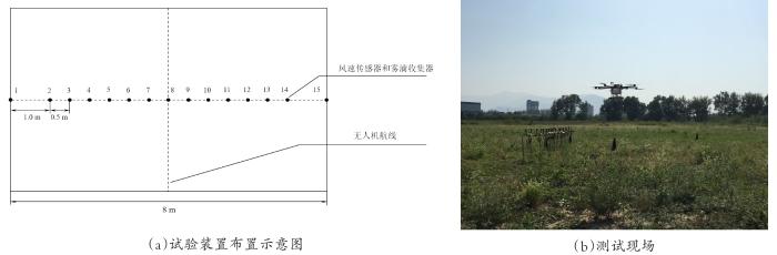 试验在北京市昌平区马池口镇北方天途航空技术发展有限公司飞行基地进行。场地为开阔空地,选取晴朗无风的天气条件进行试验(2018年9月上旬)。MMMS的传感器被排列成三向线阵置于无人机航线下方,线阵垂直于无人机航线布置。15个风速采集点沿无人机水平飞行航线轴对称分布,按无人机水平前进方向从左至右编为1~15号,中心点为8号,3~13号采集点间距0.5 m,其余4个采集点与相邻点间距为1.0 m,线阵总宽度8.0 m(图3(a))。同时,将Testo 350-XL型号环境分析仪的传感器分别放置于离地面2.0 m处,测量环境风速、温度和相对湿度。每个风速传感器安装3个叶轮用于测定获取水平沿无人机航线方向(X)、水平垂直于航线方向(Y)、竖直方向(Z)的风速,在每个采样支架上用双头夹各布置1张水敏纸和PET聚酯薄膜(麦拉片)作为雾滴收集卡,水敏纸用于测定有效喷洒幅宽,麦拉片用于测定雾滴沉积量,风速传感器和雾滴收集卡均布置在离地面1.0 m高处以模拟作物冠层顶部情况。此外,在采样区域外再设置1个风速传感器以测定试验过程中自然风对风速测量的干扰,进行数据处理时将所有测得的风速值扣除自然风的影响后再进行分析。
