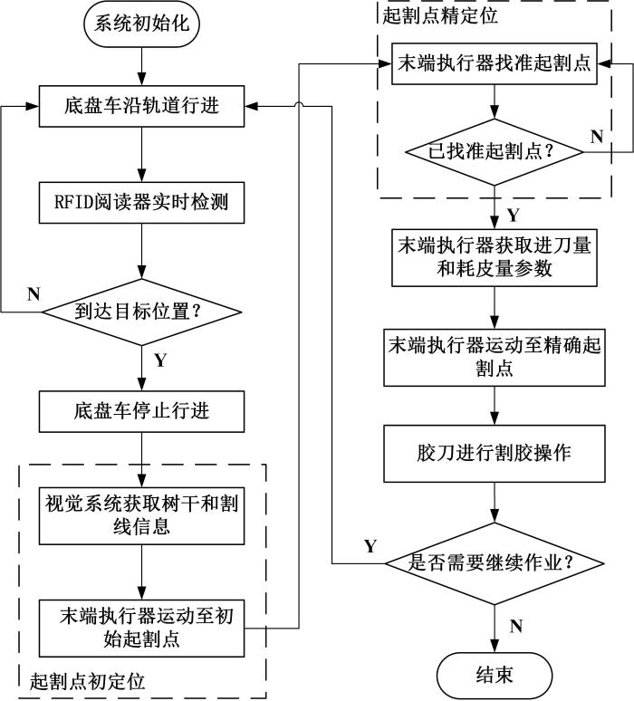 割胶机器人在启动后进行初始化,开始沿着固定轨道行进。移动底盘车上的射频识别(Radio Frequency Identification,RFID)阅读器寻找目标橡胶树前的无源标签。底盘车在到达目标位置后停止行进,安装在机械臂上的结构光源和双目立体视觉系统采集树干和割线信息。控制系统规划机械臂的初始起割点位姿。末端执行器在机械臂的带动下运动至起割点附近,进行起割点初定位。