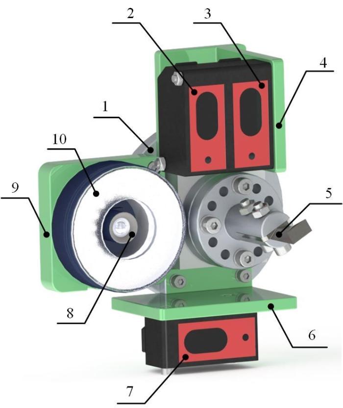 割胶机器人的末端执行器的设计应当满足结构紧凑、装卸方便、质量较小等要求,同时适用于作业对象的物理属性,包括形状、尺寸、切割力等。末端执行器采用集成化、智能化、自动化的设计理念。末端执行器的示意图如图6所示。末端执行器与机械臂末端通过法兰连接,主要由激光测距传感器U1、激光测距传感器U2、割胶刀、下激光测距传感器D1、环光源和手眼相机等10部分组成。末端执行器的总质量约为2 kg,在机械臂末端负载范围内。上、下测距传感器支架和左侧的相机支架是由ABS材料经3D打印而成。