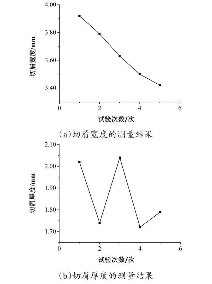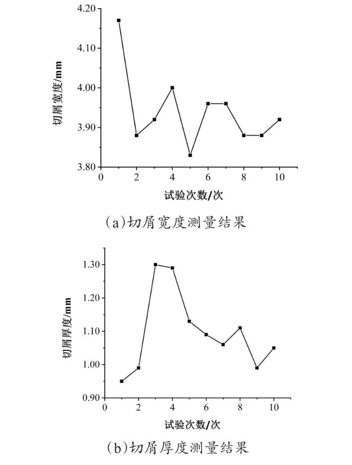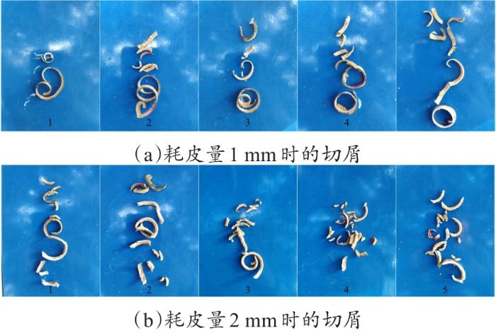 设定10 mm的橡胶树树皮高度为一个试验周期,设定切割深度为5 mm,将耗皮量设置成1 mm时进行了10次试验获得10份样品(随机选取5份样品进行切屑对比);设置成2 mm时进行了5次试验获得5份样品。每次试验的起割点位置和其余割胶轨迹参数均保持不变。每次试验结束后收集产生的条状切屑,使用游标卡尺测量其宽度和厚度并进行分析。在条状切屑上平均选取包括起割点和终割点在内的12个位置作为测量点。由于切屑在测量试验数据时容易发生断裂,因此,每次试验中的测量点并不完全对应。将所有测量数据的总平均值和标准差作为切割深度和耗皮量的精度。
