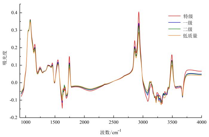 特级、一级、二级和低质量牛乳在MIRS范围内的原始吸收曲线如图1。可以看出,牛乳的光谱曲线严重重叠,由于水的干扰,1597~1712 cm-1和3024~3 680 cm-1左右的区域信噪比低[27],无法用于建模。不同牛乳的平均光谱曲线走向趋势相似(图2),表明它们的内部化学成分基本一致,但同时它们的光谱又存在差异,表明4类牛乳的化学成分含量存在差异。其中,一级牛乳和二级牛乳的平均光谱十分接近,通过肉眼难以区分,特级和低质量牛乳则与它们存在一定差异。根据福斯公司提供的乳成分的吸收情况可知,1754 cm-1左右的波峰主要与脂肪中C=O键的伸缩振动有关,2857 cm-1左右的波峰主要与脂肪酸链中的饱和C-H键的伸缩振动有关,1470 cm-1左右的波峰主要与脂肪酸链中饱和C-H键的弯曲振动有关,1538 cm-1主要与N-H键的弯曲振动有关。