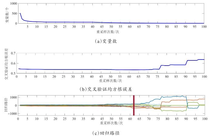 CARS算法以降低无信息变量为出发点,模型运行过程中,以PLS回归系数为衡量标准,根据交叉验证均方根误差(Root Mean Square Error of Cross-Validation,RMSECV)对应的位置选择最优的子集代表特级、一级、二级和低质量牛乳中红外光谱差异的特征变量组合。