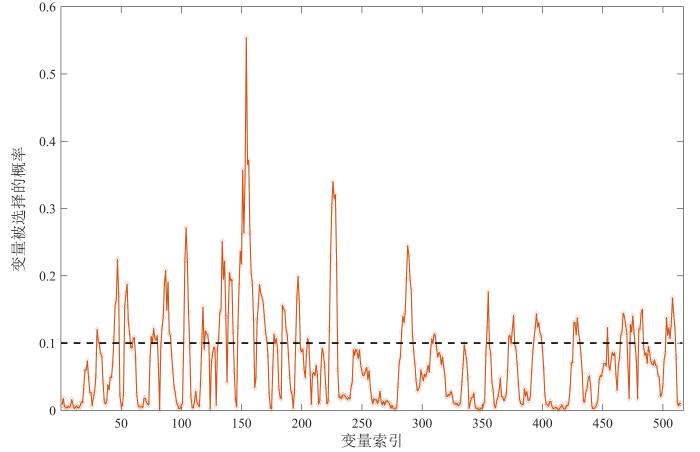 本研究中设置SFLA运行次数N为10,000,最大潜在变量数A为6,抽样变量的初始数量Q为2。利用概率的大小作为变量筛选的评价指标,在图4中,横坐标代表每一维光谱变量的编号,纵坐标代表被选择的概率。波峰越高,表明变量被选中的可能性越大。以一阶差分处理后的515维光谱为例,将515个变量被选的概率排序,以0.1为阈值,最终得到位于图中虚线上方的146个最优变量组合。