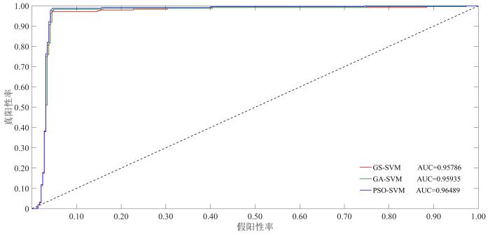 确定一阶差分-SFLA算法建立的模型效果最优后,对比不同的寻优算法对SVM模型的影响。同时,通过受试者工作特征(Receiver Operating Characteristic,ROC)曲线和ROC曲线下面积(Area Under Curve,AUC)[28]进一步评价三种SVM模型。ROC曲线可以反应分类器在某个阈值时对样本的识别能力,曲线越趋近坐标轴左上方位置,曲线下方与X轴围成的面积AUC越大,模型的性能越好。由图5可知,GS-SVM、GA-SVM、PSO-SVM模型ROC曲线的AUC分别为0.95786、0.95935和0.96489,PSO-SVM优于GS-SVM和GA-SVM模型。
