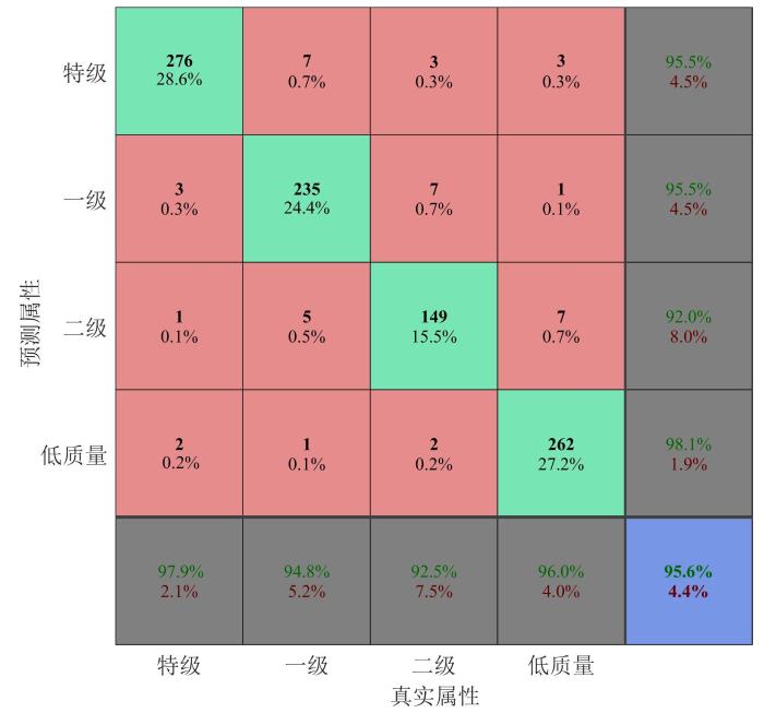 由图6可知,测试集的964个样本中,特级、一级、二级和低质量牛乳的召回率分别为97.9%、94.8%、92.5%和96.0%,精准率分别为95.5%、95.5%、92.0%和98.1%,误判数量分别为6、13、12和11个。蓝色方框为模型预测准确率,为95.6%。