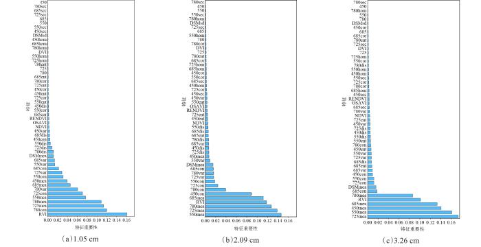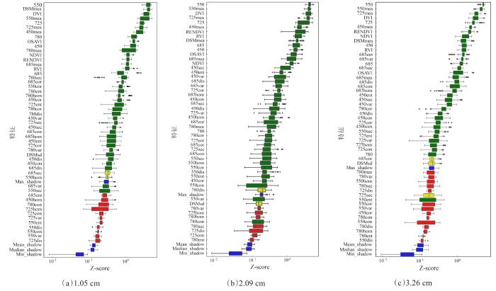 特征选择是重要的数据预处理技术,可显著提升机器学习算法的性能,增强模型的稳定性和适用性[20]。相较于其他特征优化方法,Boruta-Shap算法只包含相关特征而不影响模型性能来减少特征的数量,在Boruta算法中添加Shap值可增强重要的解释能力,减少数据过度拟合问题,目前该算法被广泛应用于不同领域,在特征集优化和提升模型精度方面均具有优良表现[21, 22]。不同的特征选择方法其筛选参数变量的标准不同,针对不同目标物属性,其结果存在较大差异,即使在相同数据集条件下,不同特征选择方法对模型的提升性能各不相同[23, 24]。本研究使用全特征集、ReliefF特征子集、RF-RFE特征子集和Boruta-Shap特征子集进行分类精度比较,发现Boruta-Shap特征选择方法在兼顾较高分类精度的基础上,可以降低数据维度,提高运算速率,在3种空间分辨率条件下(1.05、2.09和3.26 cm),总体分类精度分别为95.6%、94.6%和93.9%,表现最佳。
