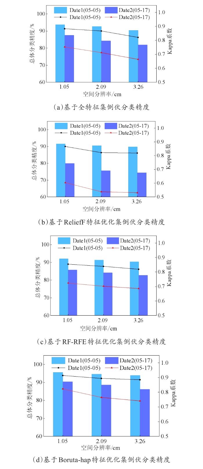 考虑到倒伏发生后具有生长恢复效应,对倒伏后12天的无人机多光谱分辨率影像采用相同的处理方法,进行分类结果的比较验证,结果如表7所示。在分辨率1.05~3.26 cm范围间,SVM、RF和KNN总体分类精度变化范围分别为81.9%~87.5%、74.4%~79.9%和86.2%~90.4%,SVM的分类效果基本上优于RF和KNN分类器,其中全特征集的分类精度最高,但对高度特征比较敏感,变化范围大,Boruta-Shap特征子集对高度特征不敏感,模型更加稳健,且保持较高分类精度。对于不同分辨率遥感影像,最佳的空间分辨率为1.05 cm,随着空间分辨率的降低,分类精度整体呈下降趋势。从图7可以看出,基于不同的特征集,倒伏后不久(5月5日)收集到的无人机多光谱影像相较于持续一段时期(5月17日)的影像,产生更高的分类精度,表明倒伏早期阶段有更好的颜色对比,倒伏一段时间后茎秆会部分直立恢复生长,导致自然颜色损失及纹理结构趋近使得分类精度降低。