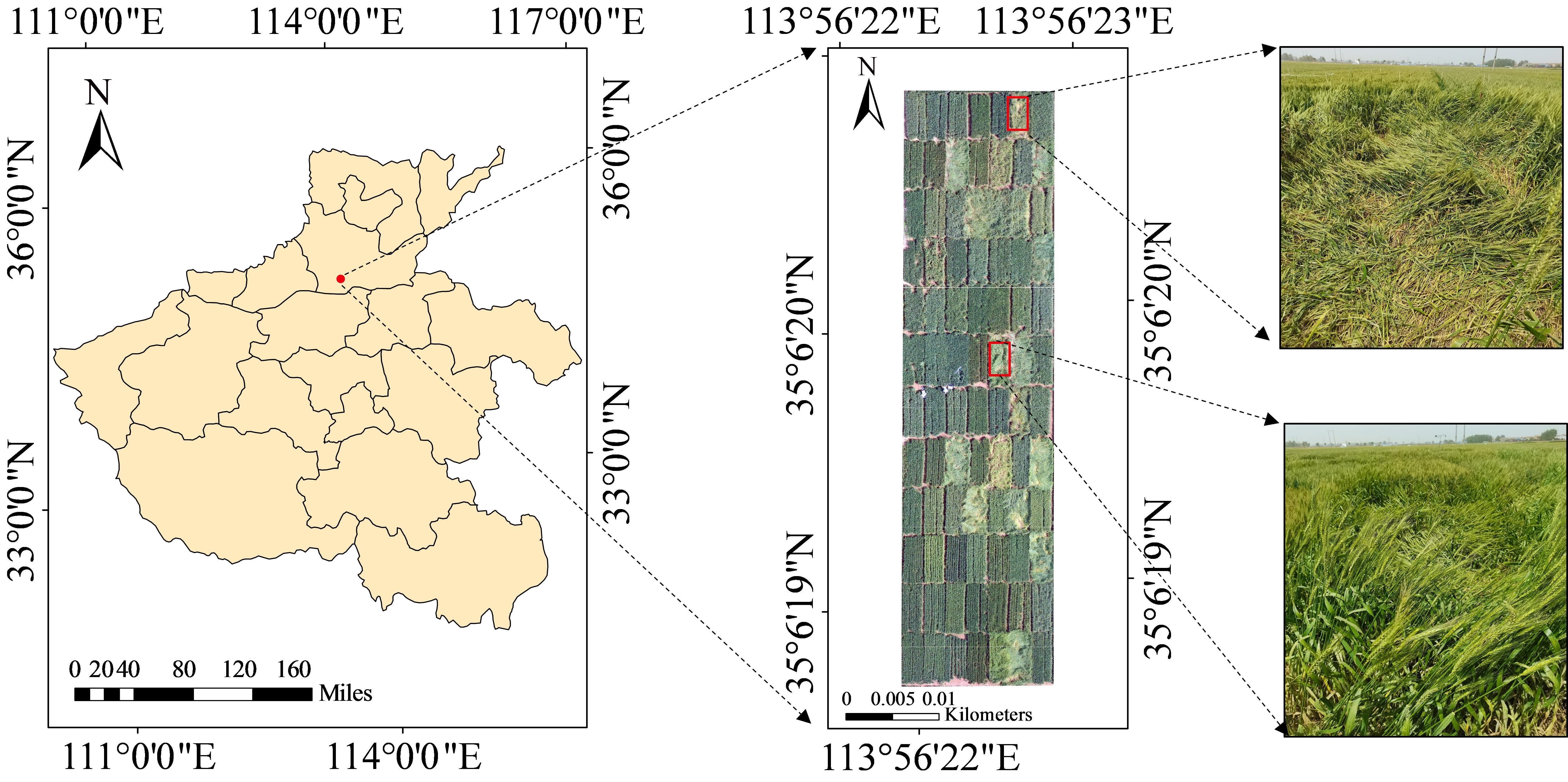 | Fig. 1 Location of wheat planting area and image of lodging within the Yuanyang science and education park, Yuanyang county, Henan province |